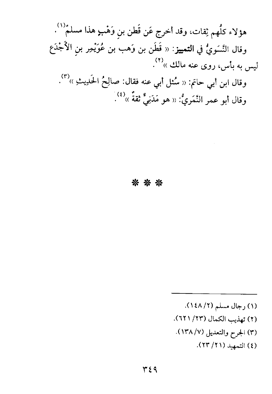 وقال النسوي في التمييز: ((قطن بن وهب بن عويمر بن الأجدع ليس به بأس، روى عنه مالك)).