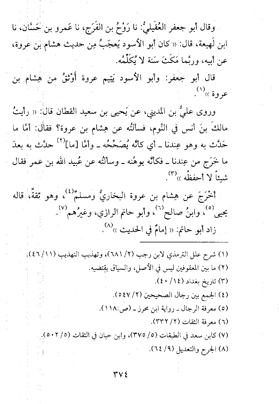 وقال أبو جعفر العقيلي: نا روح بن الفرج، نا عمرو بن حسان ابن لهيعة، قال: ((كان أبو الأسود يعجب من حديث هشام بن عروة، عن أبيه، وربما مكث سنة لا يكلمه.