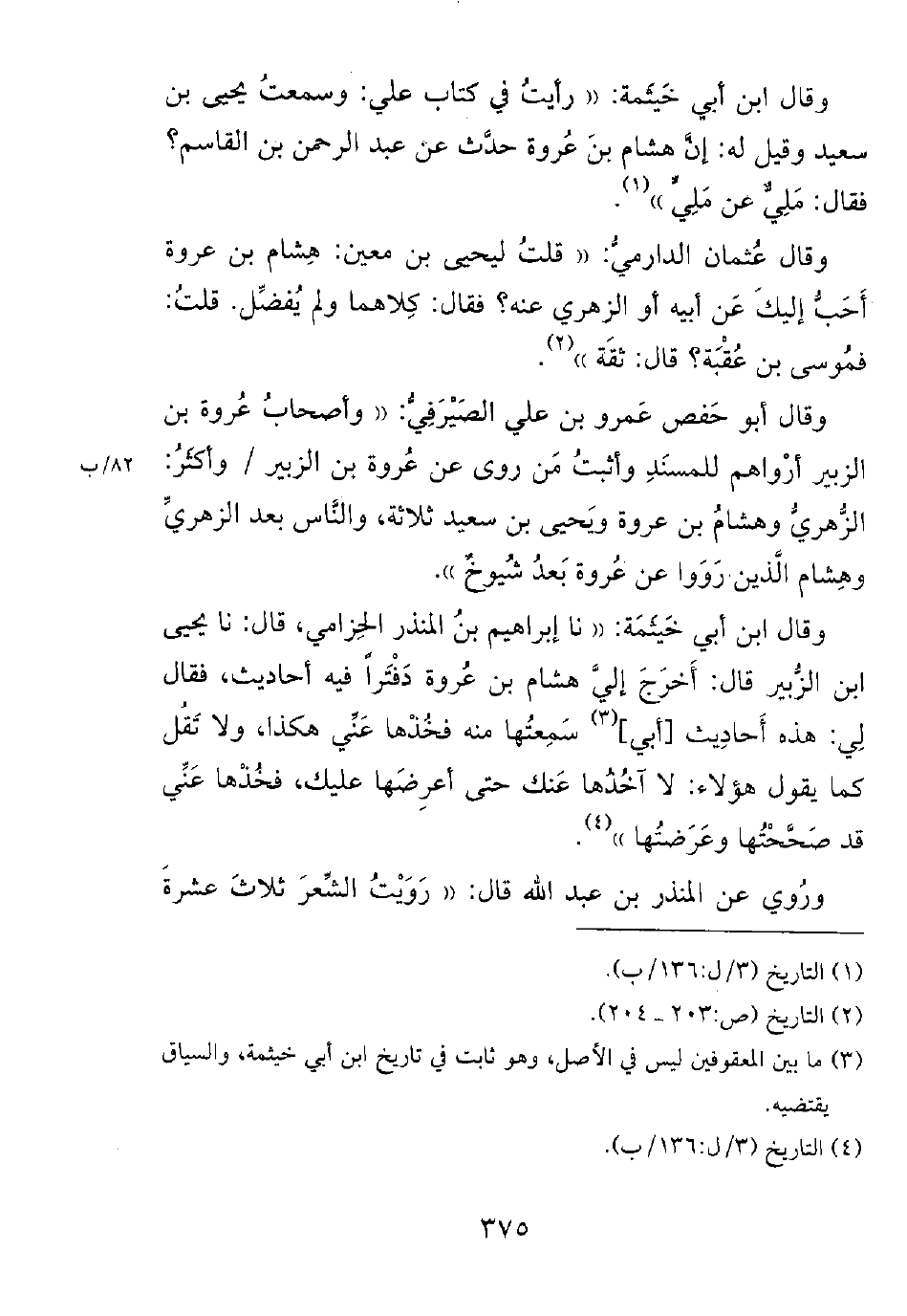 وقال ابن أبي خيثمة: ((نا إبراهيم بن المنذر الحزامي، قال: نا يحيى ابن الزبير قال: أخرج إلي هشام بن عروة دفتراً فيه أحاديث، فقال لي: هذه أحاديث [أبي] سمعتها منه فخذها عني هكذا، ولا تقل كما يقول هؤلاء: لا آخذها عنك حتى أعرضها عليك، فخذها عني قد صححتها وعرضتها)).