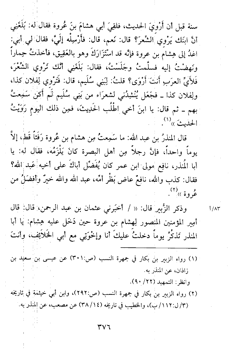 وذكر الزبير قال: ((أخبرني عثمان بن عبد الرحمن، قال: قال أمير المؤمنين المنصور لهشام بن عروة حين دخل عليه هشام: يا أبا المنذر تذكر يوماً دخلت عليك أنا وإخوتي مع أبي الخلائف، وأنت