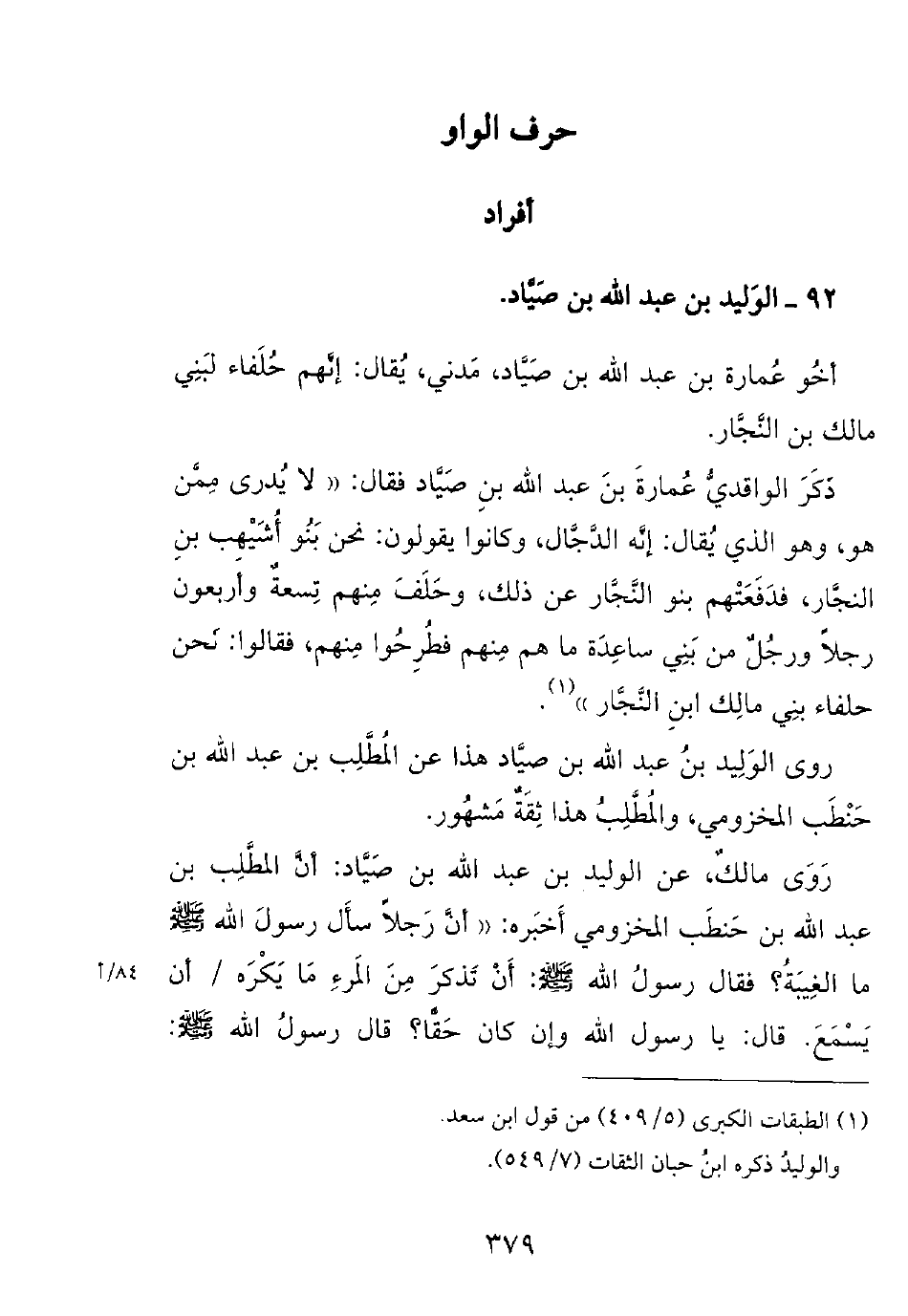 روى الوليد بن عبد الله بن صياد هذا عن المطلب بن عبد الله بن حنطب المخزومي، والمطلب هذا ثقةٌ مشهور.