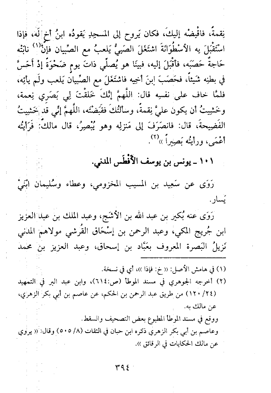 نقمةً، فاقبضه إليك، فكان يروح إلى المسجد يقوده ابن أخٍ له، فإذا استقبل به الأسطوانة اشتغل الصبي يلعب مع الصبيان فإن نابته حاجةٌ حصبه، فأقبل إليه، فبينا هو يصلي ذات يومٍ ضحوةً إذ أحس في بطنه شيئاً، فحصب ابن أخيه فاشتغل مع الصبيان يلعب ولم يأته، فلما خاف على نفسه قال: اللهم إنك خلقت لي بصري نعمة، وخشيت أن يكون علي نقمةً، وسألتك فقبضته، اللهم إني قد خشيت الفضيحة، قال: فانصرف إلى منزله وهو يبصر، قال مالكٌ: فرأيته أعمى، ورأيته بصيراً)).
