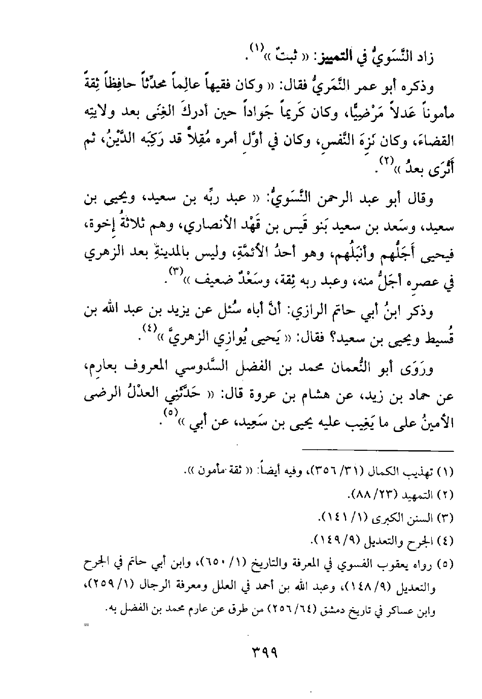 وروى أبو النعمان محمد بن الفضل السدوسي المعروف بعارم، عن حماد بن زيد، عن هشام بن عروة قال: ((حدثني العدل الرضى الأمين على ما يغيب عليه يحيى بن سعيد، عن أبي)).