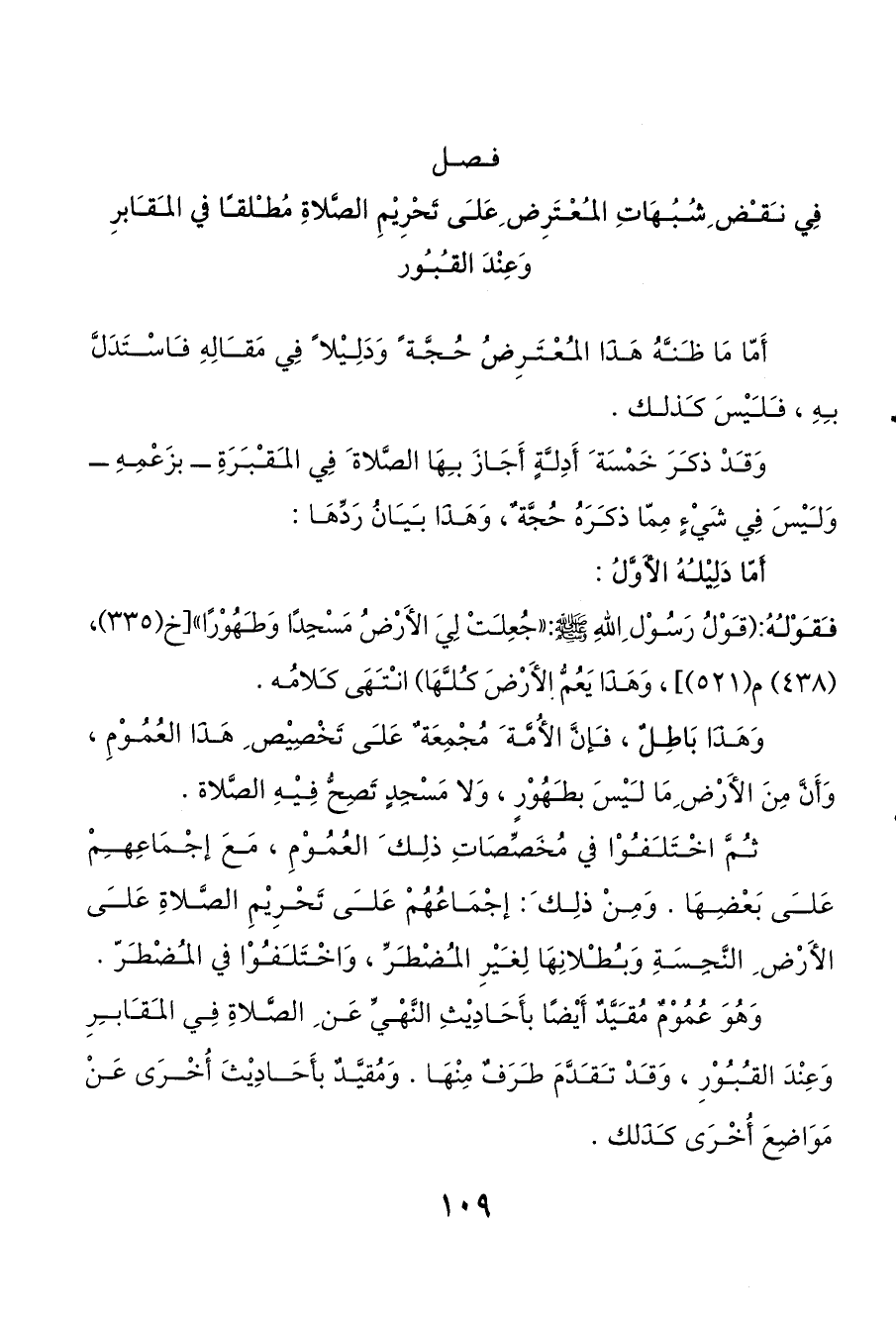 فصل فِي نقض ِشُبُهَاتِ المعْتَرِض ِعَلى تَحْرِيْمِ الصَّلاةِ مُطلقا في المقابرِ وَعِنْدَ القبور
