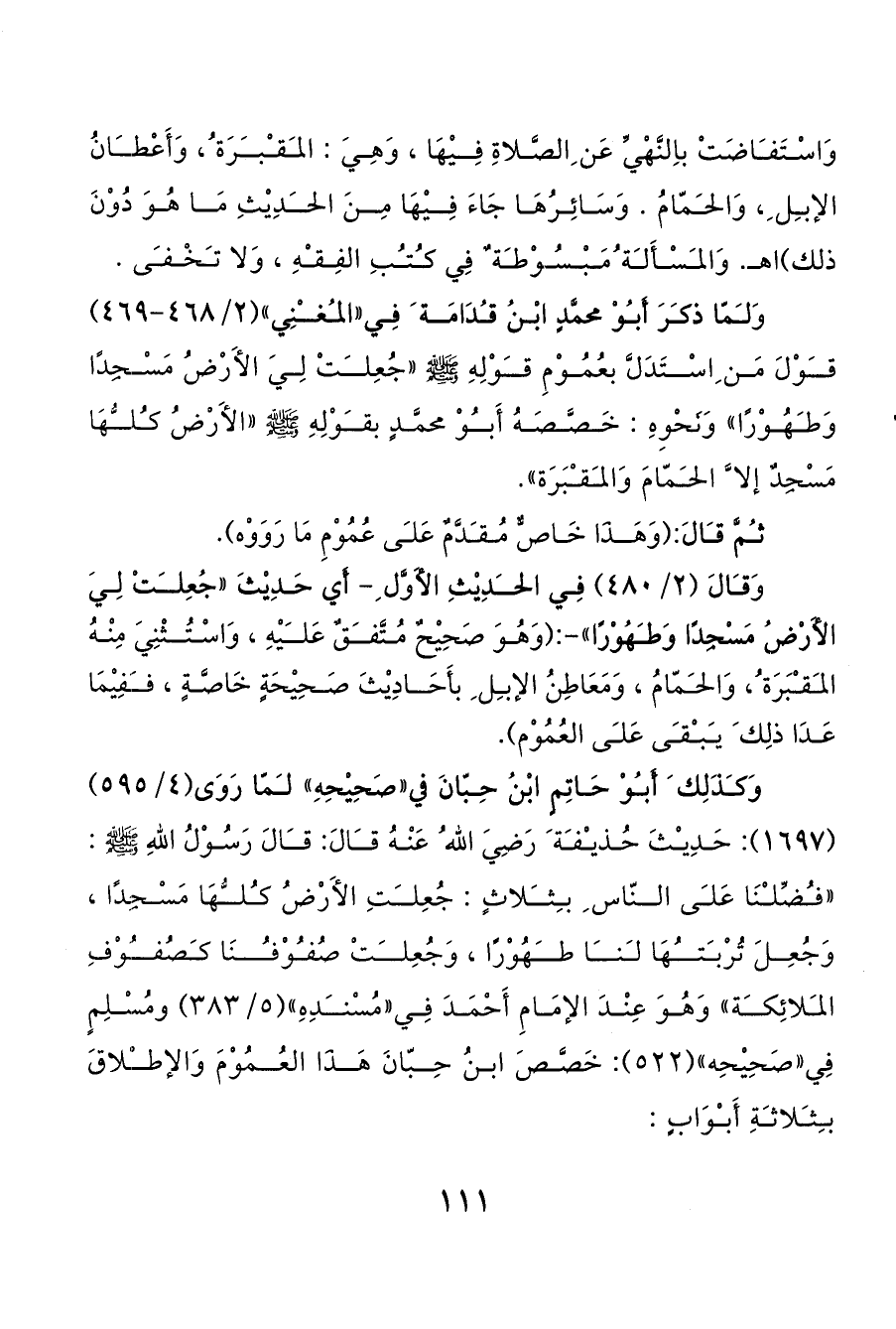 وَقالَ (2/ 480) فِي الحدِيْثِ الأَوَّل ِ- أَي حَدِيْثَ «جُعِلتْ لِيَ الأَرْضُ مَسْجِدًا وَطهُوْرًا» -: (وَهُوَ صَحِيْحٌ مُتَّفقٌ عَليْهِ، وَاسْتُثْنِيَ مِنْهُ المقبَرَة ُ، وَالحمّامُ، وَمَعَاطِنُ الإبل ِ بأَحَادِيْثَ صَحِيْحَةٍ خَاصَّةٍ، ففِيْمَا عَدَا ذلِك َ يبقى عَلى العُمُوْم).