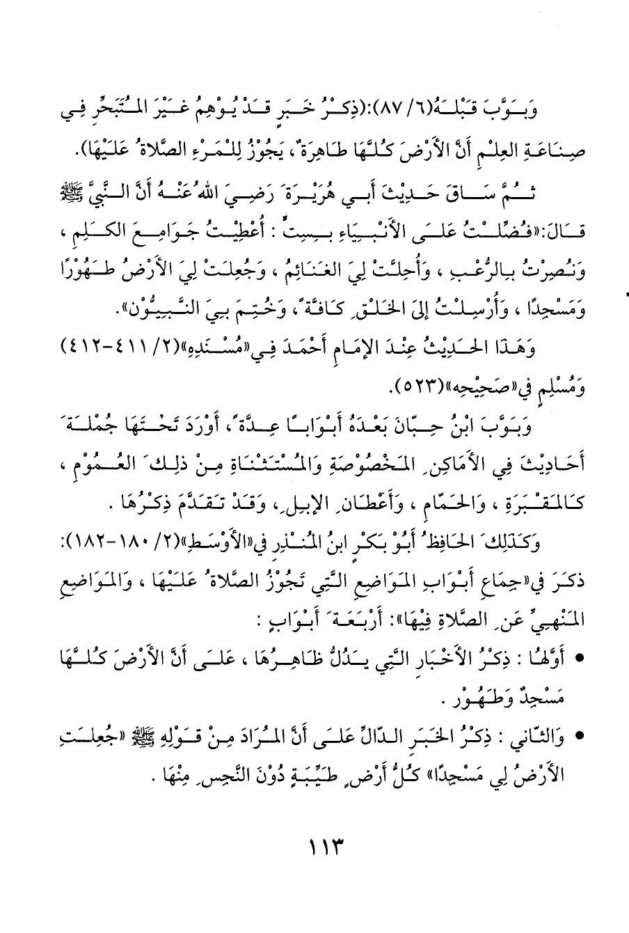 أَوَّلها: ذِكرُ الأَخْبَارِ التِي يدُلُّ ظاهِرُهَا، عَلى أَنَّ الأَرْضَ كلهَا مَسْجِدٌ وَطهُوْر.