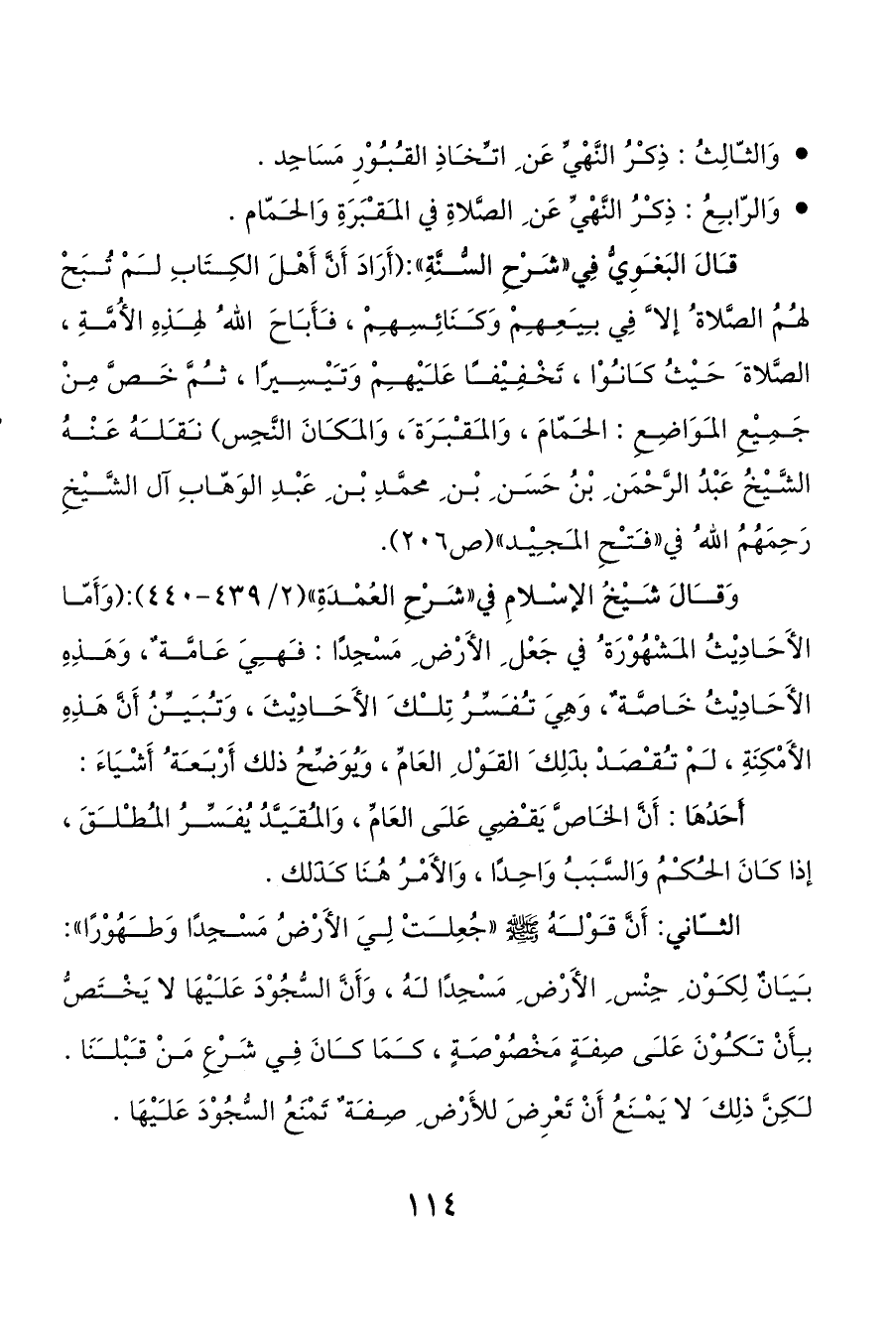 وَقالَ شَيْخُ الإسْلامِ في «شَرْحِ العُمْدَةِ» (2/ 439 - 440): (وَأَمّا الأَحَادِيْثُ المشْهُوْرَة ُ في جَعْل ِ الأَرْض ِ مَسْجِدًا: فهيَ عَامَّة ٌ، وَهَذِهِ الأَحَادِيْثُ خَاصَّة ٌ، وَهِيَ تفسِّرُ تِلك َ الأَحَادِيْثَ، وَتبينُ أَنَّ هَذِهِ الأَمْكِنَةِ، لمْ تقصَدْ بذَلِك َ القوْل ِ العَامِّ، وَيُوَضِّحُ ذلك أَرْبعة ُ أَشْيَاءَ: