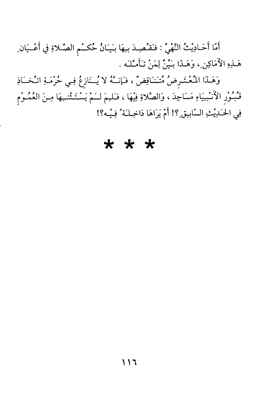 وَهَذَا المعْتَرِضُ مُتناقِضٌ، فإنهُ لا يُنَازِعُ فِي حُرْمَةِ اتخاذِ قبوْرِ الأَنبيَاءِ مَسَاجِدَ، وَالصَّلاةِ فِيْهَا، فلمَ لمْ يَسْتَثْنهَا مِنَ العُمُوْمِ فِي الحدِيْثِ السّابق ِ؟! أَمْ يَرَاهَا دَاخِلة ً فِيْه؟!