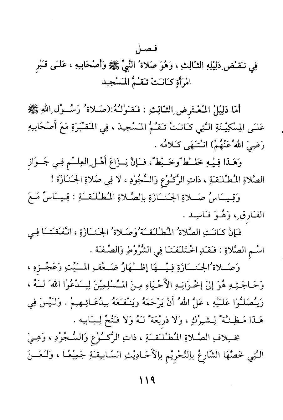 فصل فِي نقض ِدَلِيْلِهِ الثالِثِ، وَهُوَ صَلاة ُ النَّبيِّ صَلَّى اللَّهُ عَلَيْهِ وَسَلَّمَ وَأَصْحَابهِ، عَلى قبْرِ امْرَأَةٍ كانتْ تقمُّ المسْجد