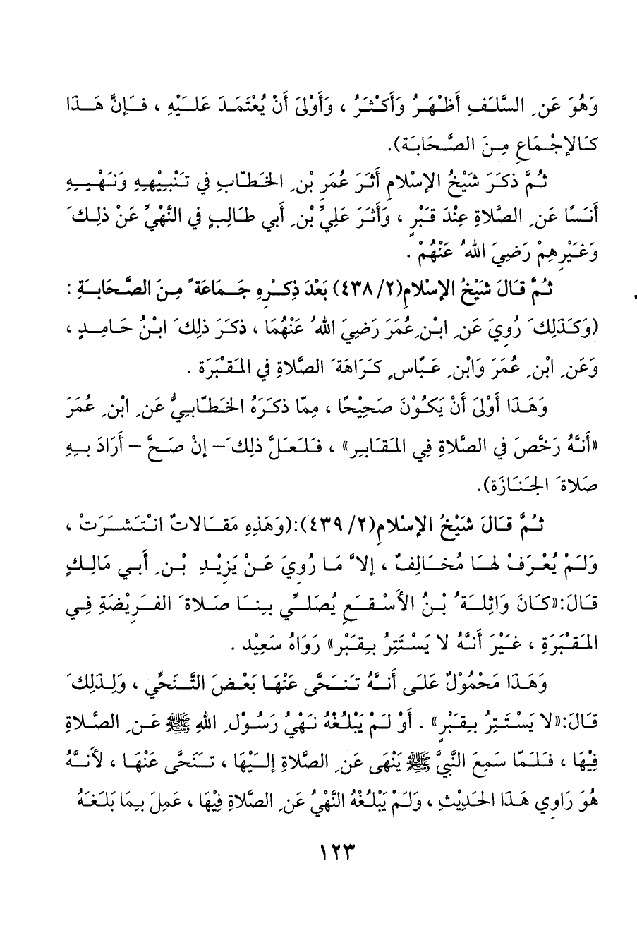ثمَّ قالَ شَيْخُ الإسْلامِ (2/ 438) بَعْدَ ذِكرِهِ جَمَاعَة ً مِنَ الصَّحَابةِ: (وَكذَلِك َ رُوِيَ عَن ِ ابن ِعُمَرَ رَضِيَ الله ُ عَنْهُمَا، ذكرَ ذلِك َ ابنُ حَامِدٍ، وَعَن ِ ابْن ِ عُمَرَ وَابْن ِ عَبّاس ٍ كرَاهَة َ الصَّلاةِ في المقبَرَة.