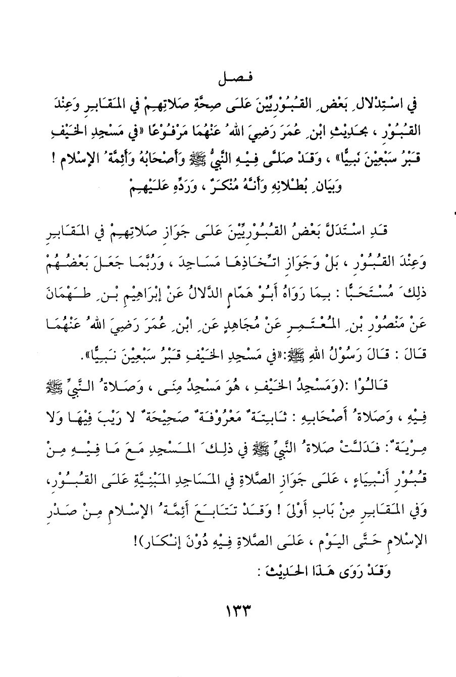 فصل في اسْتِدْلال ِ بَعْض ِ القبوْرِيِّيْنَ عَلى صِحَّةِ صَلاتِهمْ في المقابرِ وَعِنْدَ القبوْرِ، بحدِيْثِ ابْن ِ عُمَرَ رَضِيَ الله ُ عَنْهُمَا مَرْفوْعًا «في مَسْجِدِ الخيْفِ قبْرُ سَبْعِيْنَ نَبيًّا»، وَقدْ صَلى فِيْهِ النَّبيُّ صَلَّى اللَّهُ عَلَيْهِ وَسَلَّمَ وَأَصْحَابُهُ وَأَئِمَّة ُ الإسْلام! وَبيَان ِ بُطلانِهِ وَأَنهُ مُنْكرٌ، وَرَدِّهِ عَليْهمْ