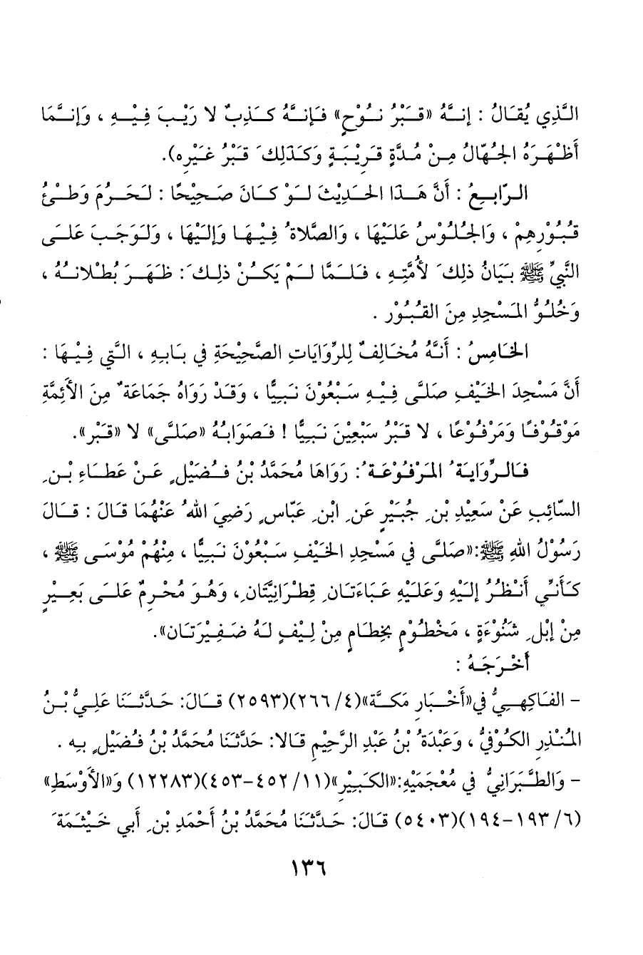 الخامِسُ: أَنهُ مُخالِفٌ لِلرِّوَايَاتِ الصَّحِيْحَةِ في بابهِ، التي فِيْهَا: أَنَّ مَسْجِدَ الخيْفِ صَلى فِيْهِ سَبْعُوْنَ نبيًّا، وَقدْ رَوَاهُ جَمَاعَة ٌ مِنَ الأَئِمَّةِ مَوْقوْفا وَمَرْفوْعًا، لا قبْرُ سَبْعِيْنَ نبيًّا! فصَوَابهُ «صَلى» لا «قبْر».