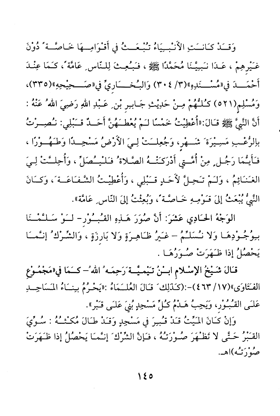 قالَ شَيْخُ الإسْلامِ ابنُ تيْميَّة َرَحِمَه ُ الله ُ- كمَا في «مَجْمُوْعِ الفتَاوَى» (17/ 463) -: (كذَلِك َ قالَ العُلمَاءُ: «يَحْرُمُ بناءُ المسَاجِدِ عَلى القبوْرِ، وَيَجِبُ هَدْمُ كلِّ مَسْجِدٍ بُنيَ عَلى قبْر».