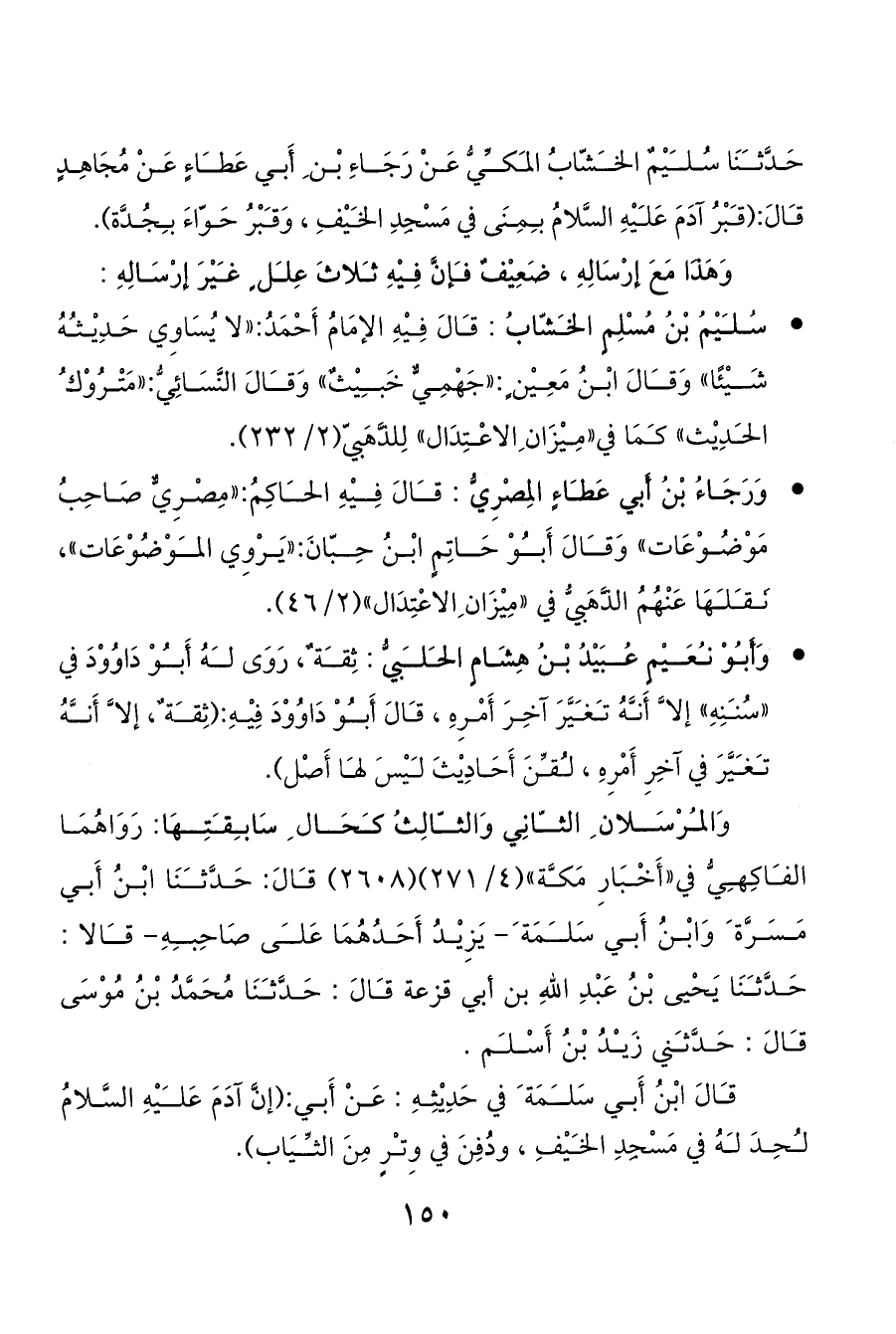 حَدَّثنَا سُليْمٌ الخشّابُ المكيُّ عَنْ رَجَاءِ بْن ِ أَبي عَطاءٍ عَنْ مُجَاهِدٍ قالَ: (قبْرُ آدَمَ عَليْهِ السَّلامُ بمِنَى في مَسْجِدِ الخيْفِ، وَقبْرُ حَوّاءَ بجُدَّة).