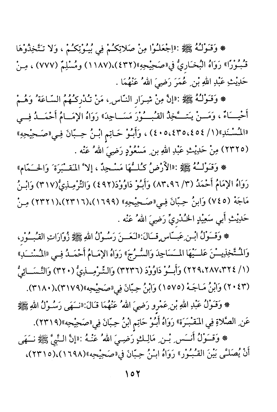 * وَقوْلهُ صَلَّى اللَّهُ عَلَيْهِ وَسَلَّمَ: «اِجْعَلوْا مِنْ صَلاتِكمْ فِي بُيوْتِكمْ، وَلا تتَّخِذُوْهَا قبوْرًا» رَوَاهُ البُخارِيُّ في «صَحِيْحِهِ» (432)، (1187) ومُسْلِمٌ (777)، مِنْ حَدِيْثِ عَبْدِ اللهِ بْن ِ عُمَرَ رَضِيَ الله ُ عَنْهُمَا.