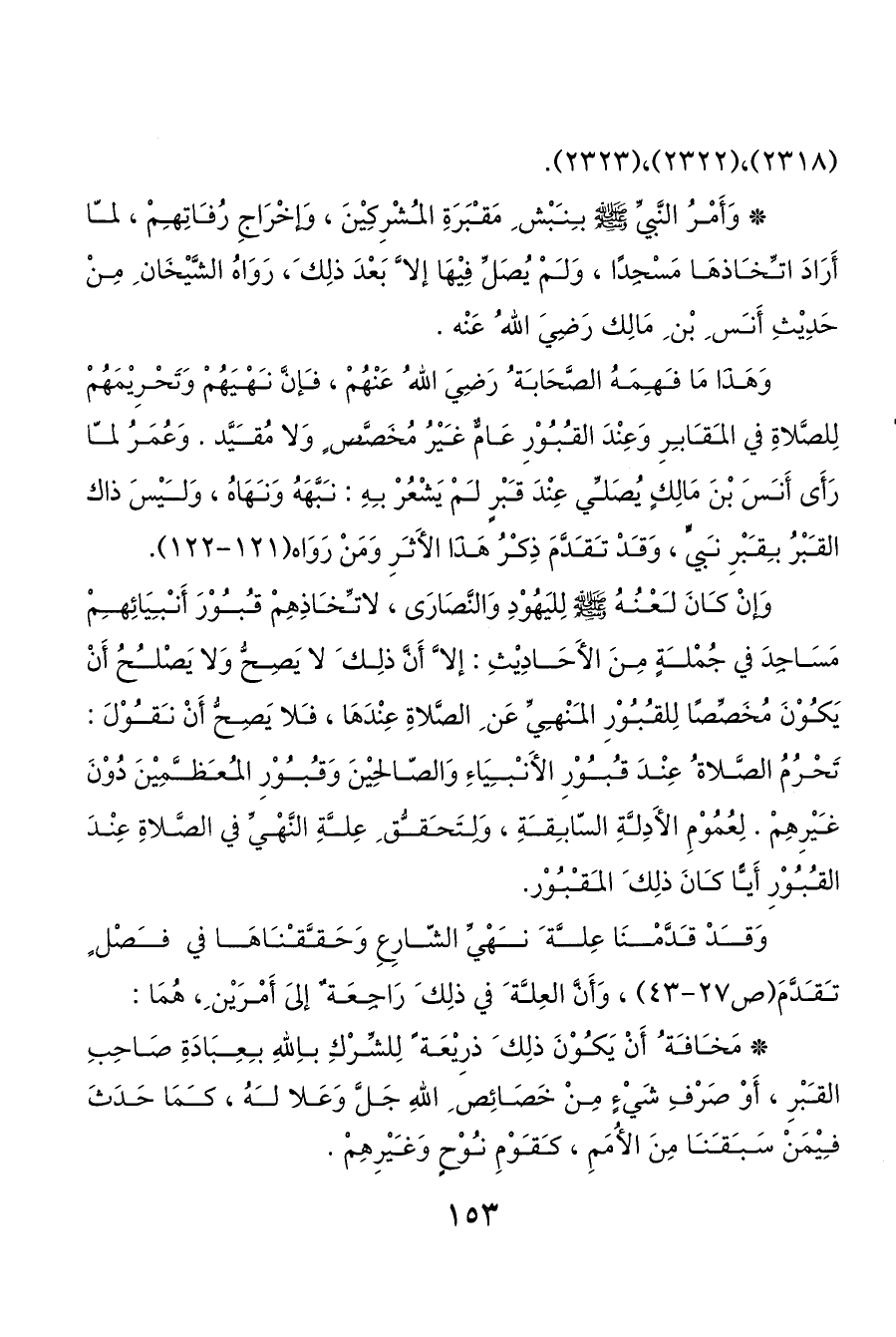 وَإنْ كانَ لعْنُهُ صَلَّى اللَّهُ عَلَيْهِ وَسَلَّمَ لِليَهُوْدِ وَالنَّصَارَى، لاتخاذِهِمْ قبوْرَ أَنبيَائِهمْ مَسَاجِدَ في جُمْلةٍ مِنَ الأَحَادِيْثِ: إلا َّ أَنَّ ذلِك َ لا يَصِحُّ وَلا يَصْلحُ أَنْ يَكوْنَ مُخَصِّصًا لِلقبوْرِ المنْهيِّ عَن ِ الصَّلاةِ عِنْدَهَا، فلا يَصِحُّ أَنْ نقوْلَ: تَحْرُمُ الصَّلاة ُ عِنْدَ قبوْرِ الأَنبيَاءِ وَالصّالحِيْنَ وَقبوْرِ المعظمِيْنَ دُوْنَ غيْرِهِمْ. لِعُمُوْمِ الأَدِلةِ السّابقةِ، وَلِتَحقق ِ عِلةِ النَّهْيِّ في الصَّلاةِ عِنْدَ القبوْرِ أَيا كانَ ذلِك َ المقبوْر.