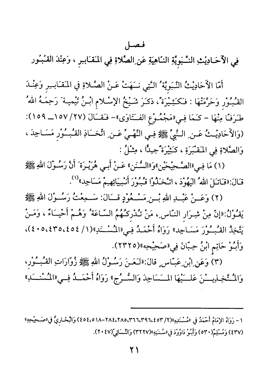 (3) وَعَن ِابْن ِعَباس ٍ قالَ: «لعَنَ رَسُوْلُ اللهِ صَلَّى اللَّهُ عَلَيْهِ وَسَلَّمَ زُوّارَاتِ القبوْرِ، وَالمتَّخِذِينَ عَليْهَا المسَاجِدَ وَالسُّرُج» رَوَاهُ أَحْمَدُ فِي «المسْندِ».