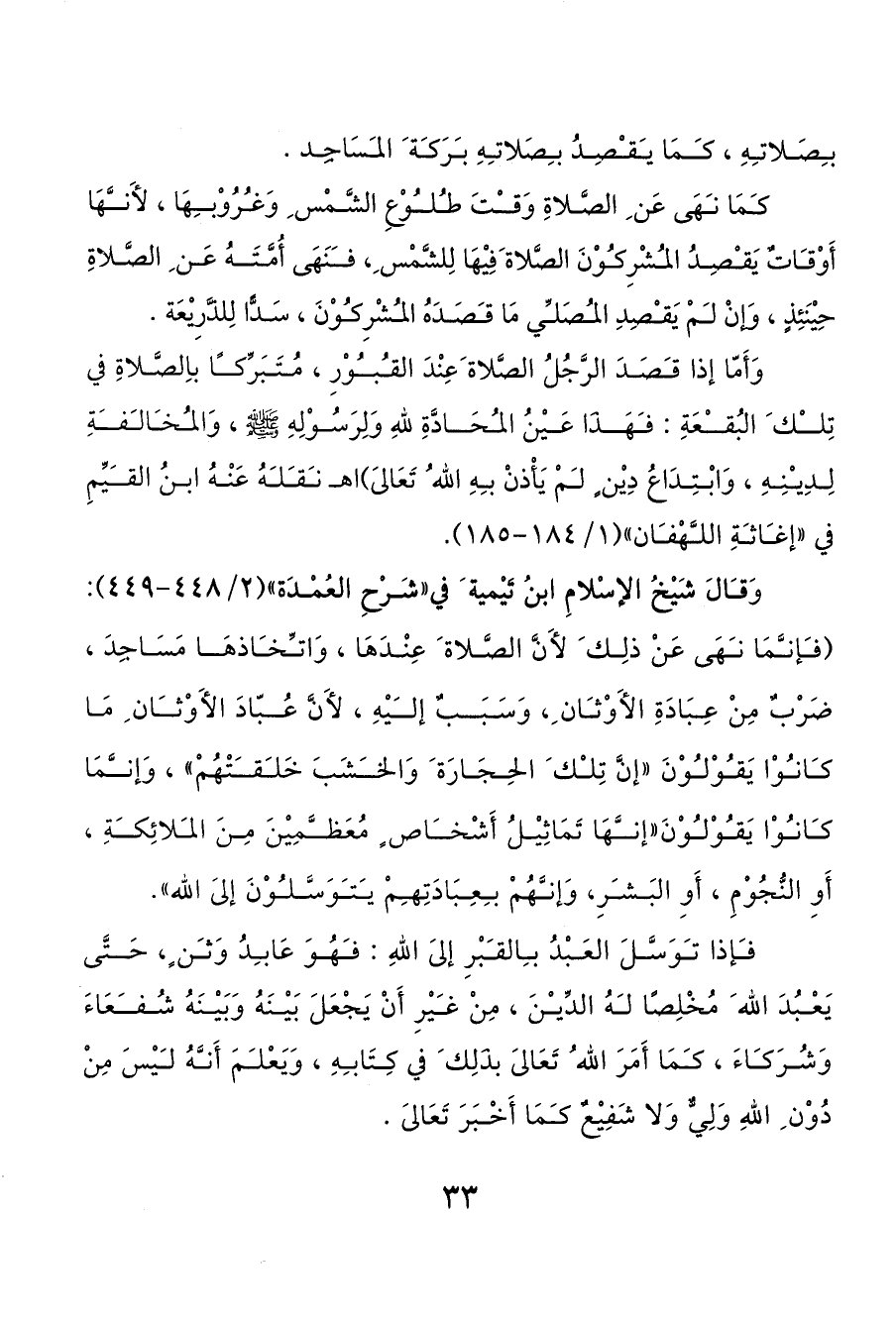 وَقالَ شَيْخُ الإسْلامِ ابنُ تَيْمية َ في «شَرْحِ العُمْدَة» (2/ 448 - 449): (فإنمَا نهَى عَنْ ذلِك َ لأَنَّ الصَّلاة َ عِنْدَهَا، وَاتخاذهَا مَسَاجِدَ، ضَرْبٌ مِنْ عِبَادَةِ الأَوْثان ِ، وَسَبَبٌ إليْهِ، لأَنَّ عُبّادَ الأَوْثان ِ مَا كانوْا يَقوْلوْنَ «إنَّ تِلك َ الحِجَارَة َ وَالخشَبَ خَلقتْهُمْ»، وَإنمَا كانوْا يَقوْلوْنَ «إنهَا تَمَاثِيْلُ أَشْخاص ٍ مُعَظمِيْنَ مِنَ الملائِكةِ، أَوِ النُّجُوْمِ، أَوِ البَشرِ، وَإنهُمْ بعِبَادَتِهمْ يتوَسَّلوْنَ إلىَ الله».
