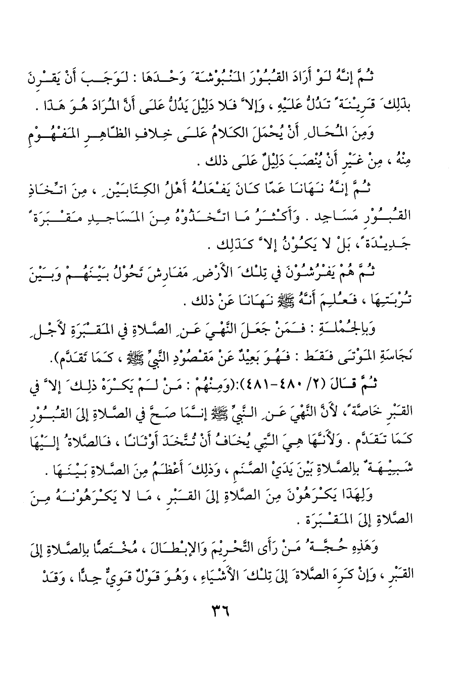 ثمَّ قالَ (2/ 480 - 481): (وَمِنْهُمْ: مَنْ لمْ يَكرَهْ ذلِك َ إلا َّ في القبْرِ خَاصَّة ً، لأَنَّ النَّهْيَ عَن ِ النَّبيِّ صَلَّى اللَّهُ عَلَيْهِ وَسَلَّمَ إنمَا صَحَّ في الصَّلاةِ إلىَ القبوْرِ كمَا تقدَّم. وَلأَنهَا هِيَ التِي يُخافُ أَنْ تُتَّخذَ أَوْثانا، فالصَّلاة ُ إليْهَا شَبيْهَة ٌ باِلصَّلاةِ بَيْنَ يَدَيْ الصَّنَمِ، وَذلِك َ أَعْظمُ مِنَ الصَّلاةِ بَيْنَهَا.