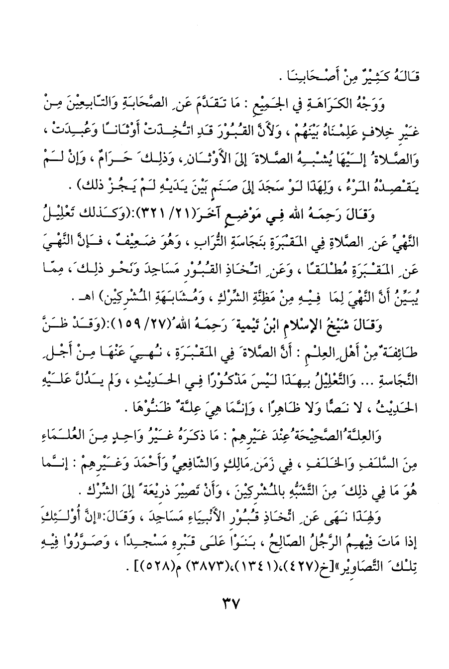 وَقالَ رَحِمَهُ الله فِي مَوْضِعٍ آخَرَ (21/ 321): (وَكذلك تَعْلِيْلُ النَّهْيِّ عَن ِ الصَّلاةِ فِي المقبَرَةِ بنَجَاسَةِ التُّرَابِ، وَهُوَ ضَعِيْفٌ، فإنَّ النَّهْيَ عَن ِ المقبَرَةِ مُطلقا، وَعَن ِ اتخاذِ القبوْرِ مَسَاجِدَ وَنَحْو ذلِك َ، مِمّا يُبيِّنُ أَنَّ النَّهْيَ لِمَا فِيْهِ مِنْ مَظِنَّةِ الشِّرْكِ، وَمُشَابهَةِ المشْرِكِيْن) اه.