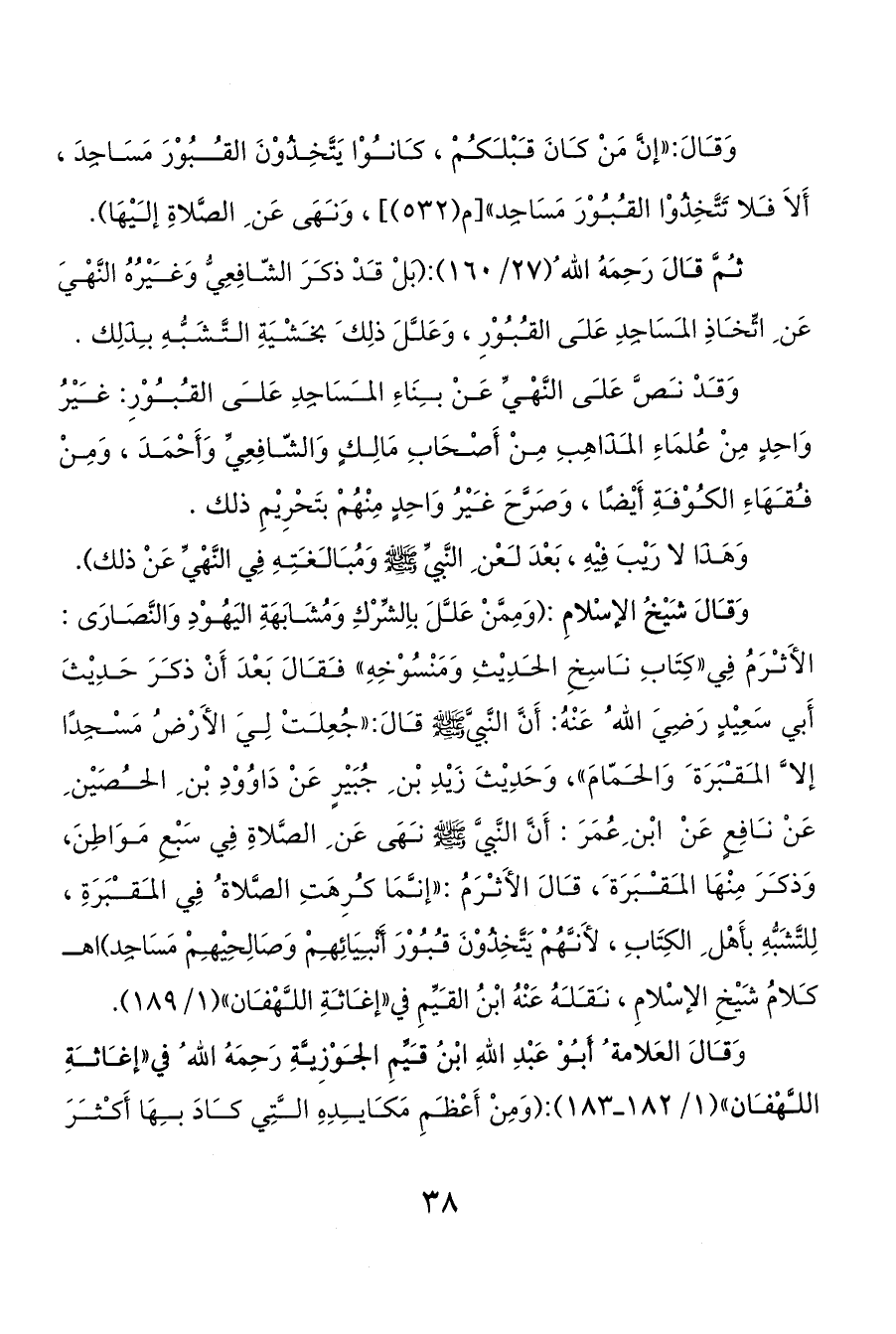 وَقالَ شَيْخُ الإسْلامِ: (وَمِمَّنْ عَللَ باِلشِّرْكِ وَمُشَابَهَةِ اليَهُوْدِ وَالنَّصَارَى: الأَثرَمُ فِي «كِتَابِ ناسِخِ الحدِيْثِ وَمَنْسُوْخِهِ» فقالَ بَعْدَ أَنْ ذكرَ حَدِيْثَ أَبي سَعِيْدٍ رَضِيَ الله ُ عَنْهُ: أَنَّ النَّبيَّ صَلَّى اللَّهُ عَلَيْهِ وَسَلَّمَ قالَ: «جُعِلتْ لِيَ الأَرْضُ مَسْجِدًا إلا َّ المقبَرَة َ وَالحمّامَ»، وَحَدِيْثَ زَيْدِ بْن ِ جُبَيْرٍ عَنْ دَاوُوْدِ بْن ِ الحصَيْن ِ عَنْ نافِعٍ عَنْ ابْن ِعُمَرَ: أَنَّ النَّبيَّ صَلَّى اللَّهُ عَلَيْهِ وَسَلَّمَ نهَى عَن ِ الصَّلاةِ فِي سَبْعِ مَوَاطِنَ، وَذكرَ مِنْهَا المقبَرَة َ، قالَ الأَثرَمُ: «إنمَا كرِهَتِ الصَّلاة ُ فِي المقبَرَةِ، لِلتَّشَبُّهِ بأَهْل ِ الكِتَابِ، لأَنهُمْ يَتَّخِذُوْنَ قبوْرَ أَنْبيَائِهمْ وَصَالِحِيْهمْ مَسَاجِد) اه كلامُ شَيْخِ الإسْلامِ، نقلهُ عَنْهُ ابْنُ القيِّمِ في «إغاثةِ اللهْفان» (1/ 189).
