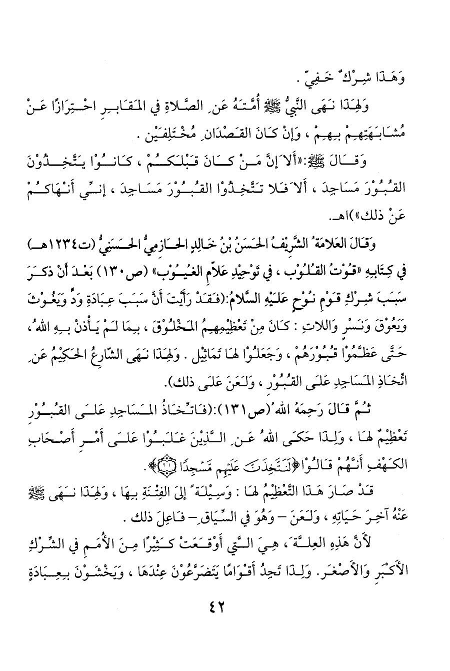 وَقالَ العَلامَة ُ الشَّرِيْفُ الحسَنُ بْنُ خَالِدٍ الحازِمِيُّ الحسَنِيُّ (ت1234هـ) في كِتَابهِ «قوْتُ القلوْب، في تَوْحِيْدِ عَلاّمِ الغيوْب» (ص130) بَعْدَ أَنْ ذكرَ سَببَ شِرْكِ قوْمِ نوْحٍ عَليْهِ السَّلامُ: (فقدْ رَأَيْتَ أَنَّ سَببَ عِبَادَةِ وَدٍّ وَيَغُوْثَ وَيَعُوْقَ وَنسْرٍ وَاللاتِ: كانَ مِنْ تَعْظِيْمِهمُ المخْلوْقَ، بمَا لمْ يَأْذنْ بهِ الله ُ، حَتَّى عَظمُوْا قبوْرَهُمْ، وَجَعَلوْا لها تَمَاثِيْل. وَلهِذَا نهَى الشّارِعُ الحكِيْمُ عَن ِ اتِّخاذِ المسَاجِدِ عَلى القبوْرِ، وَلعَنَ عَلى ذلك).