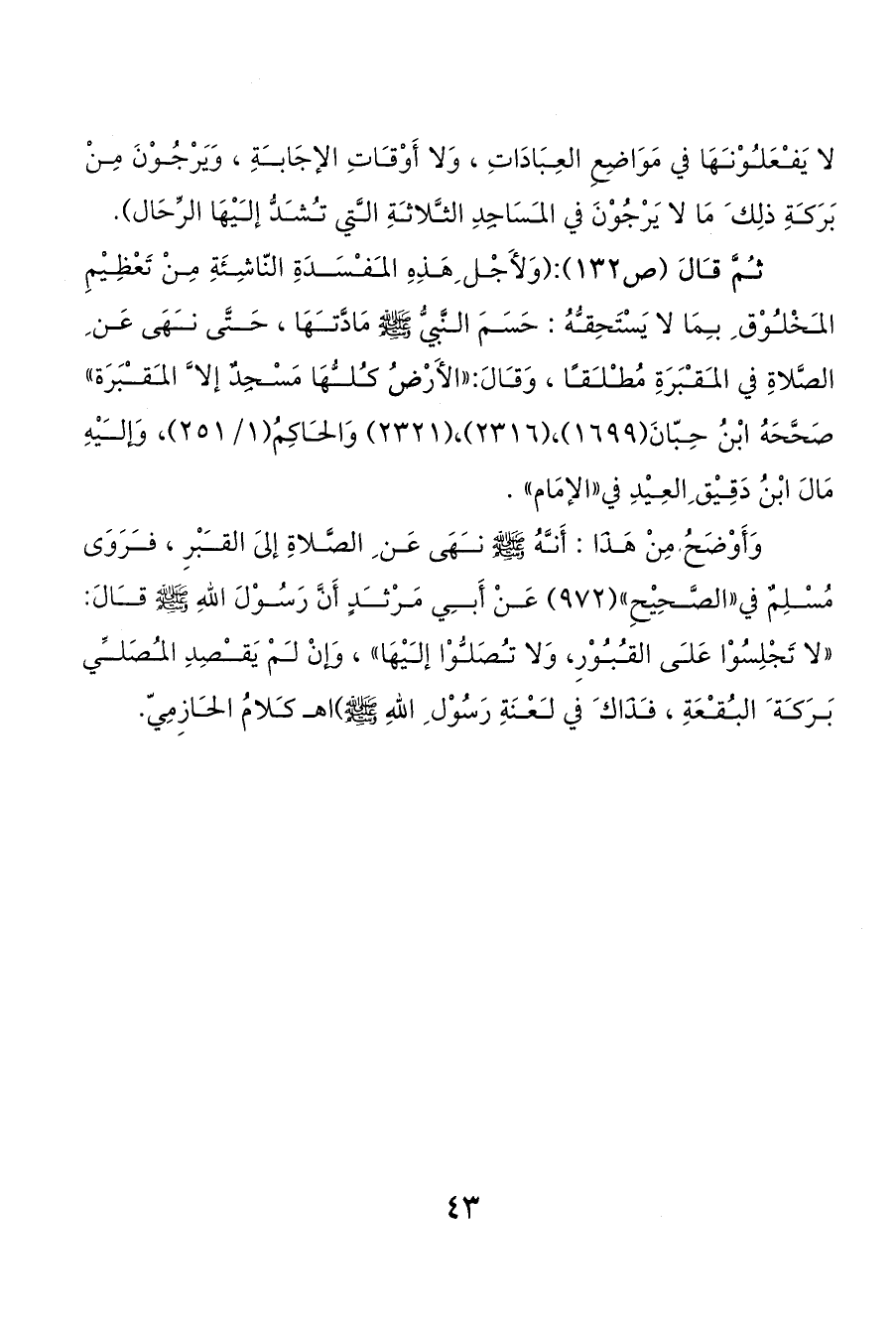 ثمَّ قالَ (ص132): (وَلأَجْل ِهَذِهِ المفسَدَةِ النّاشِئَةِ مِنْ تَعْظِيْمِ المخْلوْق ِ بمَا لا يَسْتَحِقهُ: حَسَمَ النَّبيُّ صَلَّى اللَّهُ عَلَيْهِ وَسَلَّمَ مَادَّتهَا، حَتَّى نهَى عَن ِ الصَّلاةِ في المقبَرَةِ مُطلقا، وَقالَ: «الأَرْضُ كلهَا مَسْجِدٌ إلا َّ المقبَرَة» صَحَّحَهُ ابْنُ حِبّانَ (1699)، (2316)، (2321) وَالحاكِمُ (1/ 251)، وَإليْهِ مَالَ ابْنُ دَقِيْق ِالعِيْدِ في «الإمَام».