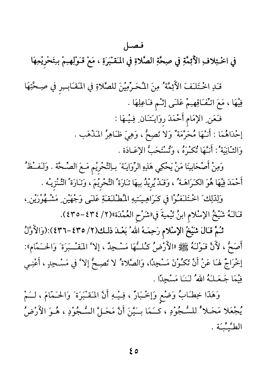 ثمَّ قالَ شَيْخُ الإسْلامِ رَحِمَهُ الله ُ بَعْدَ ذلك (2/ 435 - 436): (وَالأَوَّلُ أَصَحُّ، لأَنَّ قوْلهُ صَلَّى اللَّهُ عَلَيْهِ وَسَلَّمَ «الأَرْضُ كلهَا مَسْجِدٌ، إلا َّ المقبَرَة َ وَالحمّام»: إخْرَاجٌ لها عَنْ أَنْ تَكوْنَ مَسْجِدًا، وَالصَّلاة ُ لا تَصِحُّ إلا َّ في مَسْجِدٍ، أَعْنِي فِيْمَا جَعَلهُ الله ُ لنا مَسْجِدًا.