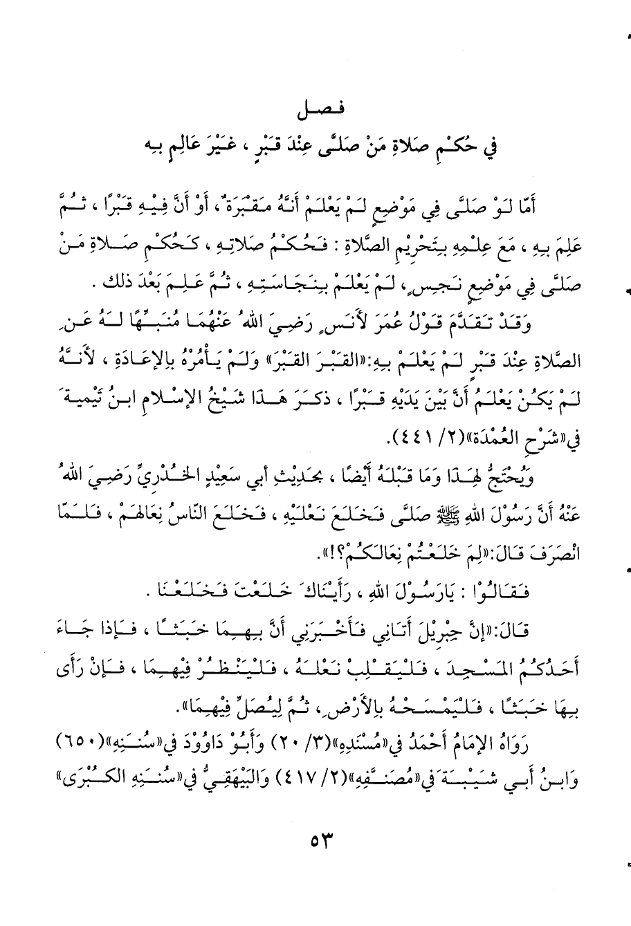 وَقدْ تقدَّمَ قوْلُ عُمَرَ لأَنس ٍ رَضِيَ الله ُ عَنْهُمَا مُنبهًا لهُ عَن ِ الصَّلاةِ عِنْدَ قبْرٍ لمْ يَعْلمْ بهِ: «القبْرَ القبْرَ» وَلمْ يَأْمُرْهُ باِلإعَادَةِ، لأَنهُ لمْ يَكنْ يَعْلمُ أَنَّ بَيْنَ يَدَيْهِ قبْرًا، ذكرَ هَذَا شَيْخُ الإسْلامِ ابنُ تَيْمية َ في «شَرْحِ العُمْدَة» (2/ 441).