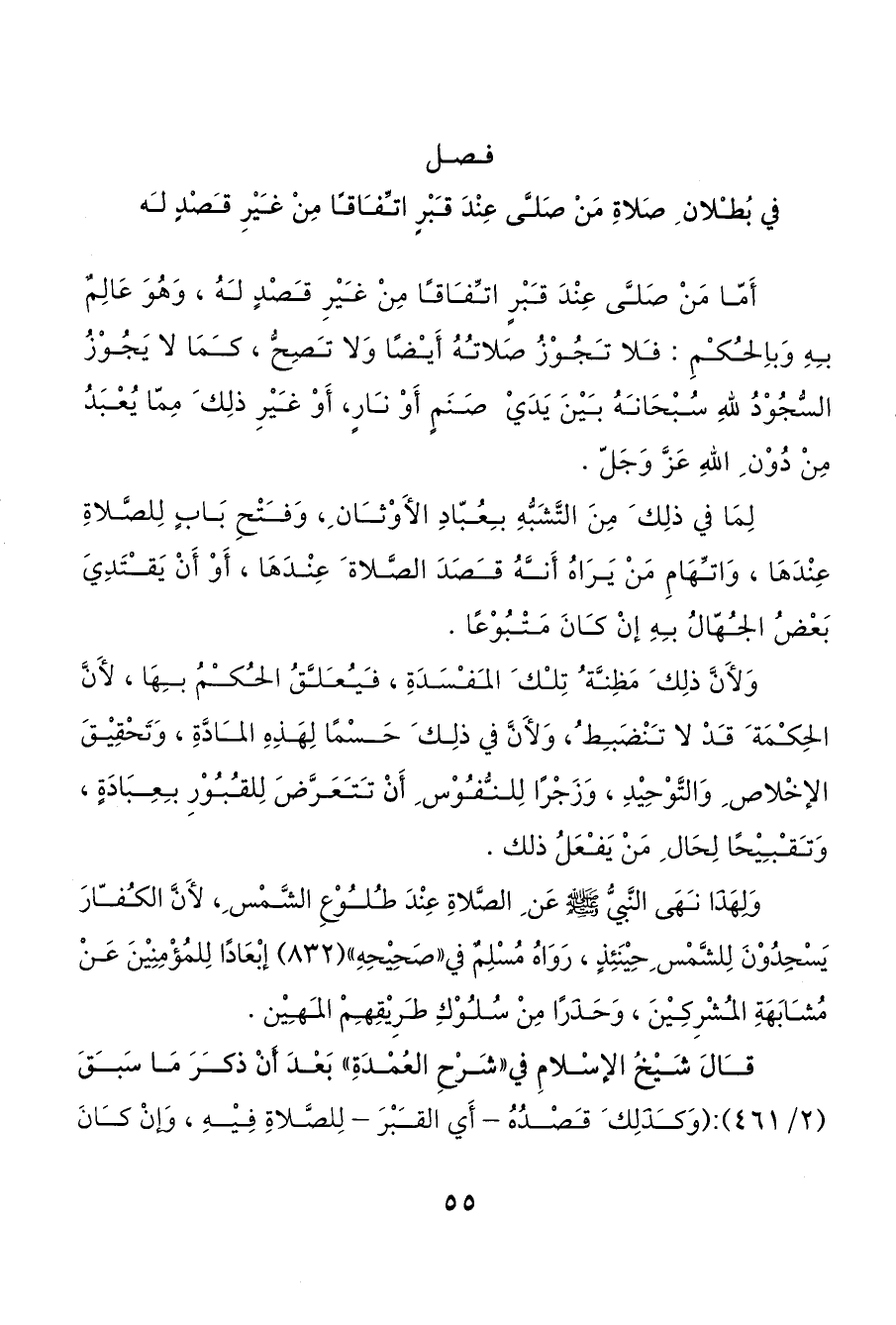 قالَ شَيْخُ الإسْلامِ في «شَرْحِ العُمْدَةِ» بَعْدَ أَنْ ذكرَ مَا سَبقَ (2/ 461): (وَكذَلِك َ قصْدُهُ - أَي القبْرَ - لِلصَّلاةِ فِيْهِ، وَإنْ كانَ