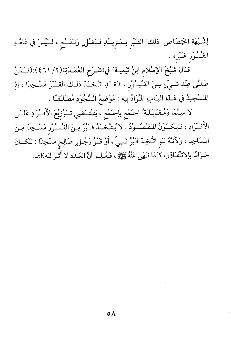 قالَ شَيْخُ الإسْلامِ ابنُ تَيْمية َ في «شَرْحِ العُمْدَةِ» (2/ 461): (فمَنْ صَلى عِنْدَ شَيْءٍ مِنَ القبوْرِ، فقدِ اتخذَ ذلك القبْرَ مَسْجِدًا، إذِ المسْجدُ في هَذَا البابِ المرَادُ بهِ: مَوْضِعُ السُّجُوْدِ مُطلقا.