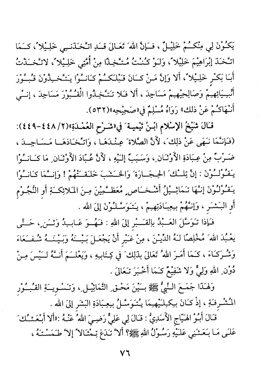 وَلهذَا جَمَعَ النَّبيُّ صَلَّى اللَّهُ عَلَيْهِ وَسَلَّمَ بيْنَ مَحْق ِ التَّمَاثِيْل ِ، وَتسْوِيةِ القبوْرِ المشْرِفةِ، إذْ كانَ بكليْهمَا يتوَسَّلُ بعِبَادَةِ البَشَرِ إلىَ الله.