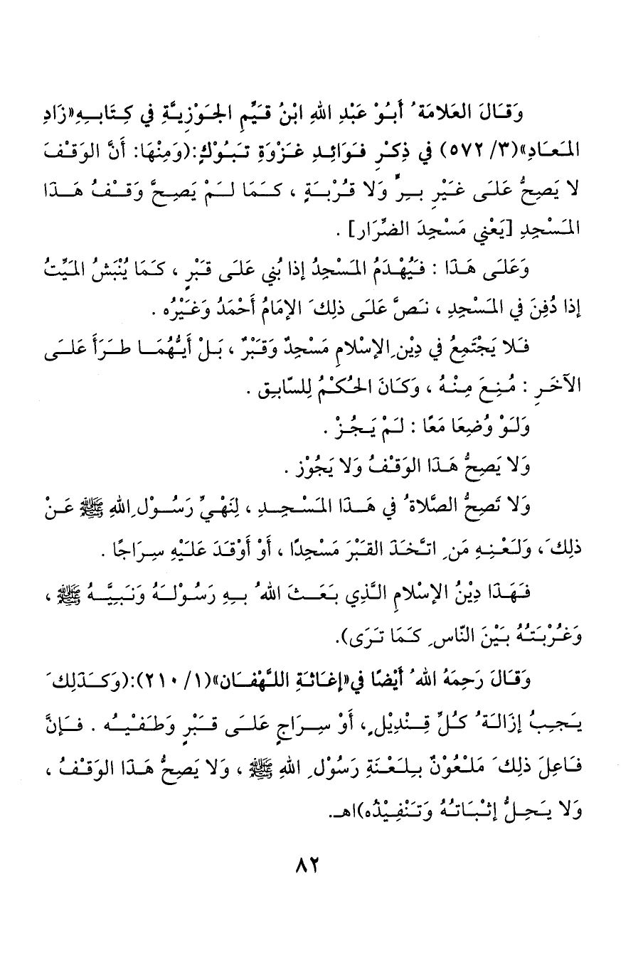 وَقالَ العَلامَة ُ أَبوْ عَبْدِ اللهِ ابْنُ قيِّمِ الجوْزِيةِ في كِتَابهِ «زَادِ المعادِ» (3/ 572) في ذِكرِ فوَائِدِ غزْوَةِ تبوْكٍ: (وَمِنْهَا: أَنَّ الوَقفَ لا يَصِحُّ عَلى غيْرِ برٍّ وَلا قرْبةٍ، كمَا لمْ يَصِحَّ وَقفُ هَذَا المسْجِدِ [يَعْني مَسْجِدَ الضِّرَار].