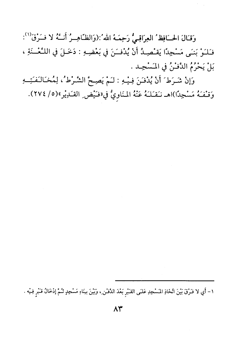 وَقالَ الحافِظ ُ العِرَاقِيُّ رَحِمَهُ الله ُ: (وَالظاهِرُ أَنهُ لا فرْقَ (¬1): فلوْ بَنى مَسْجِدًا يَقصِدُ أَنْ يُدْفنَ في بَعْضِهِ: دَخَلَ في اللعْنَةِ، بَلْ يَحْرُمُ الدَّفنُ في المسْجِد.