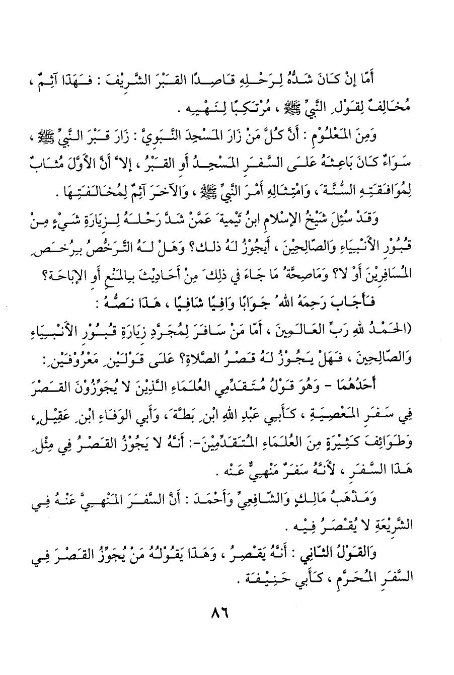 (الحمْدُ للهِ رَبِّ العَالمِينَ، أَمّا مَنْ سَافرَ لِمُجَرَّدِ زِيَارَةِ قبوْرِ الأَنبيَاءِ وَالصّالِحِينَ، فهَلْ يجُوْزُ لهُ قصْرُ الصَّلاةِ؟ عَلى قوْليْن ِ مَعْرُوْفيْن ِ: