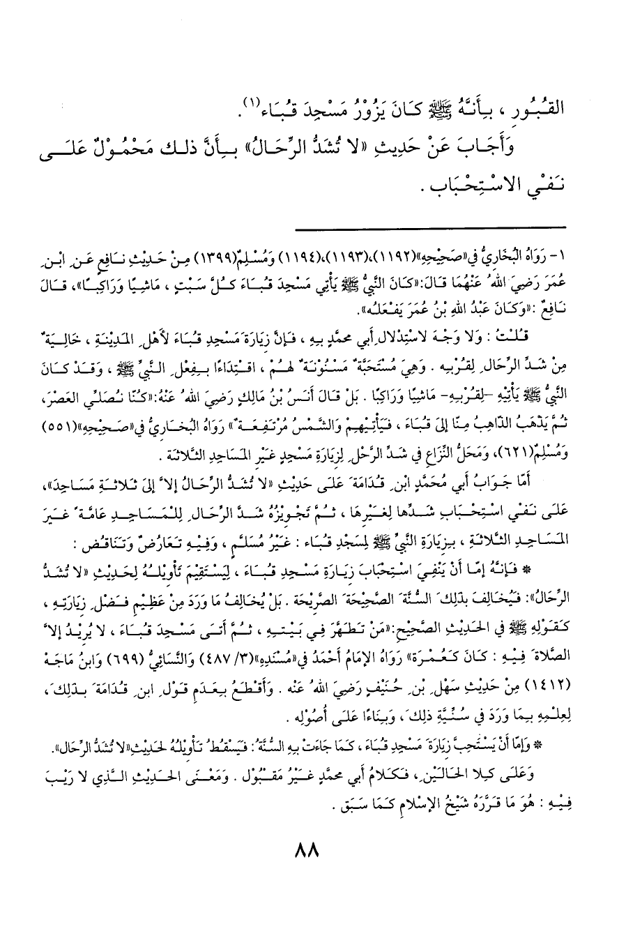 * فإنهُ إمّا أَنْ يَنْفِيَ اسْتِحْبَابَ زِيَارَةِ مَسْجِدِ قباءَ، لِيَسْتَقِيْمَ تَأْوِيْلهُ لِحَدِيْثِ «لا تُشَدُّ الرِّحَالُ»: فيُخالِفَ بذَلِك َ السُّنَّة َ الصَّحِيْحَة َ الصَّرِيْحَة. بَلْ يُخالِفُ مَا وَرَدَ مِنْ عَظِيْمِ فضْل ِ زِيَارَتِهِ، كقوْلِهِ صَلَّى اللَّهُ عَلَيْهِ وَسَلَّمَ في الحدِيْثِ الصَّحِيْحِ: «مَنْ تطهَّرَ فِي بَيْتهِ، ثمَّ أَتى مَسْجِدَ قباءَ، لا يُرِيْدُ إلا َّ الصَّلاة َ فِيْهِ: كانَ كعُمْرَة» رَوَاهُ الإمَامُ أَحْمَدُ في «مُسْنَدِهِ» (3/ 487) وَالنَّسَائِيُّ (699) وَابنُ مَاجَهْ (1412) مِنْ حَدِيْثِ سَهْل ِ بْن ِ حُنَيْفٍ رَضِيَ الله ُ عَنْه. وَأَقطعُ بعَدَمِ قوْل ِ ابن ِ قدَامَة َ بذَلِك َ، لِعِلمِهِ بمَا وَرَدَ في سُنِّيَّةِ ذلِك َ، وَبنَاءًا عَلى أُصُوْلِه.
