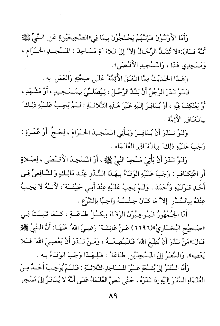 أَمّا الجمْهُورُ فيوجِبُوْنَ الوَفاءَ بكلِّ طاعَةٍ، كمَا ثبتَ فِي «صَحِيْحِ البُخارِيِّ» (6696) عَنْ عَائِشَة َ رَضِيَ الله ُ عَنْهَا: أَنَّ النَّبيَّ صَلَّى اللَّهُ عَلَيْهِ وَسَلَّمَ قالَ: «مَنْ نذَرَ أَنْ يُطِيْعَ الله َ فليطِعْهُ، وَمَنْ نذَرَ أَنْ يَعْصِيَ الله َ فلا يَعْصِه». وَالسَّفرُ إلىَ المسْجِدَيْن ِ طاعَة ٌ: فلِهَذَا وَجَبَ الوَفاءُ به.