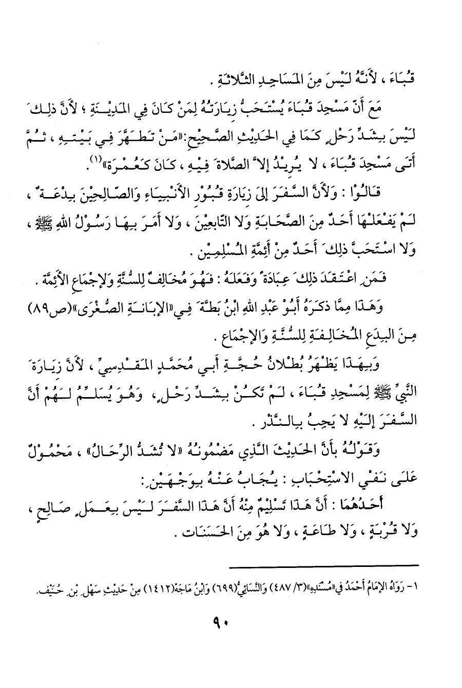 وَبهَذَا يَظهَرُ بُطلانُ حُجَّةِ أَبي مُحَمَّدٍ المقدِسِيِّ، لأَنَّ زِيَارَة َ النَّبيِّ صَلَّى اللَّهُ عَلَيْهِ وَسَلَّمَ لِمَسْجِدِ قباءَ، لمْ تَكنْ بشَدِّ رَحْل ٍ، وَهُوَ يُسَلمُ لهُمْ أَنَّ السَّفرَ إليْهِ لا يَجِبُ بالنذْر.