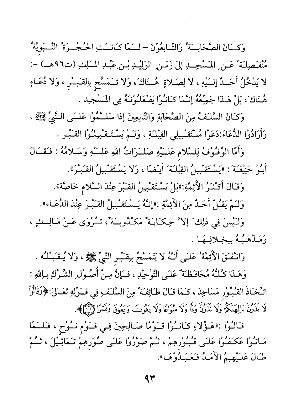 وَهَذَا كلهُ مُحَافظة ٌ عَلى التَّوْحِيْدِ، فإنَّ مِنْ أُصُوْل ِ الشِّرْكِ باِللهِ: اتخاذَ القبوْرِ مَسَاجِدَ، كمَا قالَ طائِفة ٌ مِنَ السَّلفِ فِي قوْلِهِ تَعَالىَ: {وَقَالُوا لا تَذَرُنَّ آلِهَتَكُمْ وَلا تَذَرُنَّ وَدّاً وَلا سُوَاعاً وَلا يَغُوثَ وَيَعُوقَ وَنَسْراً}.