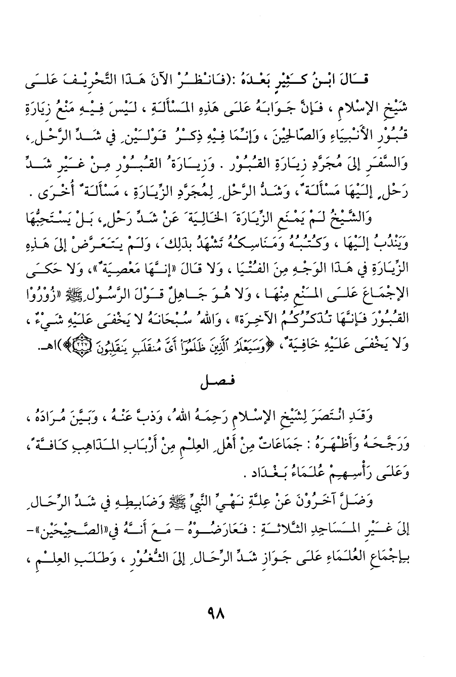 وَالشَّيْخُ لمْ يَمْنَعِ الزِّيارَة َ الخالِيَة َ عَنْ شَدِّ رَحْل ٍ، بَلْ يَسْتَحِبُّهَا وَيَنْدُبُ إليْهَا، وَكتبهُ وَمَنَاسِكهُ تَشْهَدُ بذَلِك َ، وَلمْ يتعَرَّضْ إلىَ هَذِهِ الزِّيارَةِ في هَذَا الوَجْهِ مِنَ الفتْيَا، وَلا قالَ «إنهَا مَعْصِيَة ٌ»، وَلا حَكى الإجْمَاعَ عَلى المنْعِ مِنْهَا، وَلا هُوَ جَاهِلٌ قوْلَ الرَّسُوْل ِ صَلَّى اللَّهُ عَلَيْهِ وَسَلَّمَ «زُوْرُوْا القبوْرَ فإنهَا تذَكرُكمُ الآخِرَة»، وَالله ُ سُبْحَانهُ لا يَخْفى عَليْهِ شَيْءٌ، وَلا يَخْفى عَليْهِ خَافِيَة ٌ، {وَسَيَعْلَمُ الَّذِينَ ظَلَمُوا أَيَّ مُنقَلَبٍ يَنقَلِبُونَ}) اه.