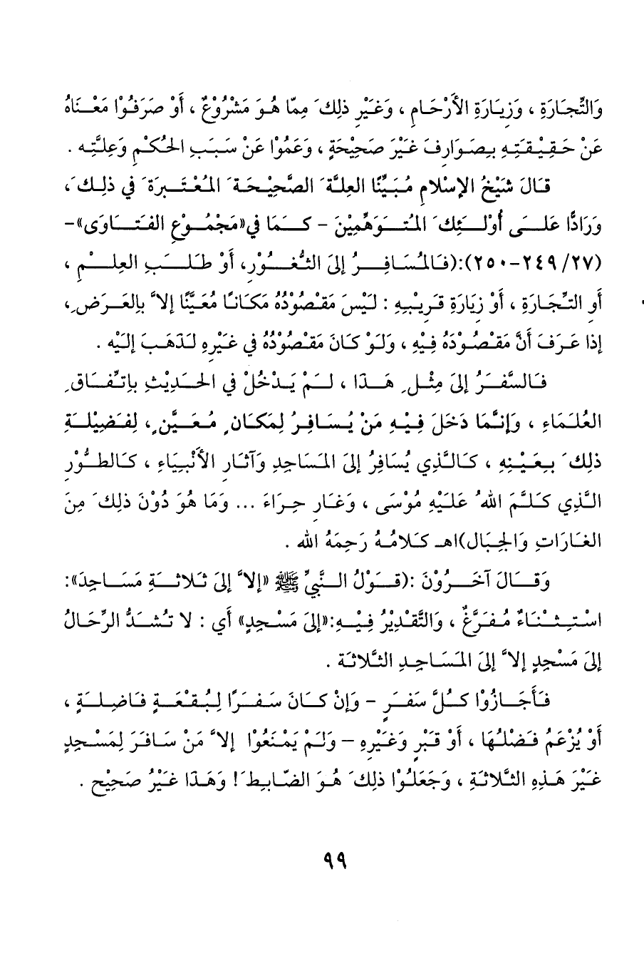 قالَ شَيْخُ الإسْلامِ مُبَيِّنًا العِلة َ الصَّحِيْحَة َ المعْتَبرَة َ في ذلِك َ، وَرَادًّا عَلى أُوْلئِك َ المتوَهِّمِيْنَ - كمَا في «مَجْمُوْعِ الفتاوَى» - (27/ 249 - 250): (فالمسَافِرُ إلىَ الثغوْرِ، أَوْ طلبِ العِلمِ، أَوِ التجَارَةِ، أَوْ زِيَارَةِ قرِيبهِ: ليْسَ مَقصُوْدُهُ مَكانا مُعَيَّنًا إلا َّ باِلعَرَض ِ، إذا عَرَفَ أَنَّ مَقصُوْدَهُ فِيْهِ، وَلوْ كانَ مَقصُوْدُهُ في غيْرِهِ لذَهَبَ إليْه.