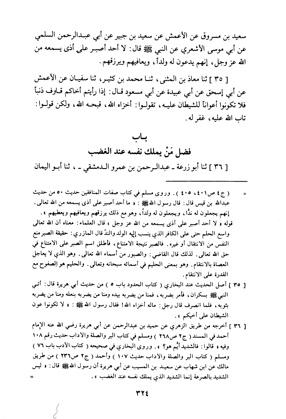 36 - ثنا أَبُو زُرْعَةَ عَبْدُ الرَّحْمَنِ بْنُ عَمْرٍو الدِّمَشْقِيُّ، ثنا أَبُو الْيَمَانِ -[325]- الْحَكَمُ بْنُ نَافِعٍ، أنا شُعَيْبُ بْنُ أَبِي حَمْزَةَ، عَنِ الزُّهْرِيِّ، عَنْ حُمَيْدِ بْنِ عَبْدِ الرَّحْمَنِ، عَنْ أَبِي هُرَيْرَةَ قَالَ: قَالَ رَسُولُ اللَّهِ صَلَّى اللهُ عَلَيْهِ وَسَلَّمَ: «§لَيْسَ الشَّدِيدُ بِالصُّرْعَةِ» قَالُوا: وَمَا الشَّدِيدُ يَا رَسُولَ اللَّهِ؟ قَالَ: «الَّذِي يَمْلِكُ نَفْسَهُ عِنْدَ الْغَضَبِ»