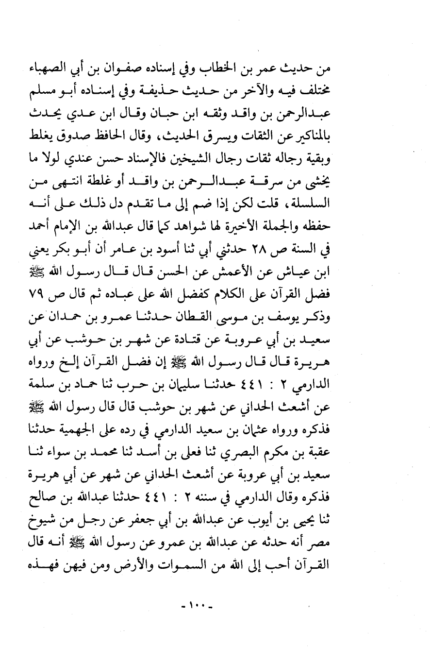 من حديث عمر بن الخطاب وفي إسناده صفوان بن أبي الصهباء مختلف فيه، والآخر من حديث حذيفة، وفي إسناده أبو مسلم ... عبد الرحمن بن واقد وثقه ابن حبان. وقال ابن عدي: يحدث بالمناكير عن الثقات ويسرق الحديث. وقال الحافظ: صدوق يغلط. وبقية رجاله ثقات رجال الشيخين فالإسناد حسن عندي لولا ما يخشى من سرقة عبد الرحمن بن واقد أو غلطه. انتهى من السلسة، قلت: لكن إذا ضم إلى ما تقدم دل ذلك على أنه حفظه والجملة الأخيرة لها شواهد كما قال عبد الله بن الإمام أحمد في السنة (ص 82) حدثني أبي ثنا أسود بن عامر لأن أبو بكر يعني ابن عياش عن الأعمش عن الحسن قال: قال رسول الله - صلى الله عليه وسلم -: «فضل القرآن على الكلام كفضل الله على عباده ثم قال (ص 79) وذكر يوسف بن موسى القطان حدثنا عمرو بن حمدان عن سعيد بن أبي عروبة عن قتادة عن شهر بن حوشب عن أبي هريرة قال: قال رسول الله - صلى الله عليه وسلم -: «إن فضل القرآن ... إلخ. ورواه الدارمي (2: 441) حدثنا سليمان بن حرب ثنا حماد بن سلمة عن أشعث الحداني عن شهر بن حوشب قال: قال رسول الله - صلى الله عليه وسلم - فذكره. ورواه عثمان بن سعيد الدارمي في رده على الجهمية حدثنا عقبة بن مكرم البصري ثنا فعلى بن أسد ثنا محمد بن سواء ثنا سعيد بن أبي عروبة عن أشعث الحداني عن شهر عن أبي هريرة ... فذكره.