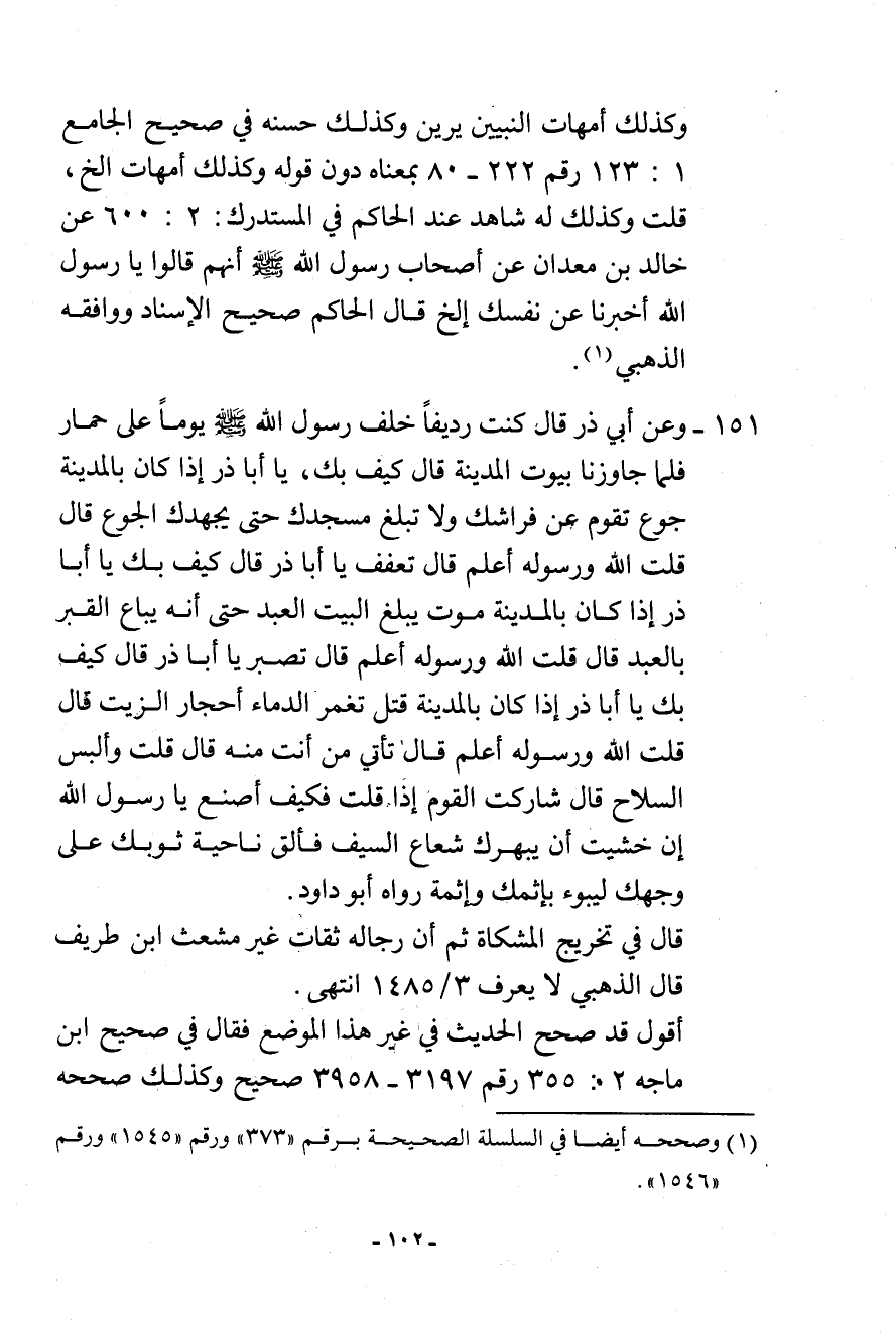 151- وعن أبي ذر قال: كنت رديفًا خلف رسول الله - صلى الله عليه وسلم - يومًا على حمار فلما جاوزنا بيوت المدينة قال: «كيف بك، يا أبا ذر إذا كان بالمدينة جوع تقوم عن فراشك ولا تبلغ مسجدك حتى يجهدك الجوع» ، قال: قلت: الله ورسوله أعلم. قال: «تعفف يا أبا ذر» ، قال: «كيف بك يا أبا ذر إذا كان بالمدينة موت يبلغ البيت العبد حتى أنه يباع القبر بالعبد» ، قال: قلت: الله ورسوله أعلم. قال: «تصبر يا أبا ذر» ، قال: «كيف بك يا أبا ذر إذا كان بالمدينة قتل تغمر الدماء أحجار الزيت» ، قال: قلت: الله ورسوله أعلم. قال: «تأتي من أنت منه» ، قال: قلت: وألبس السلاح. قال: «شاركت القوم إذًا» ، قلت: فكيف أصنع يا رسول الله [قال] «إن خشيت أن يبهرك شعاع السيف فألق ناحية ثوبك على وجهك ليبوء بإثمك وإثمه» . رواه أبو داود.