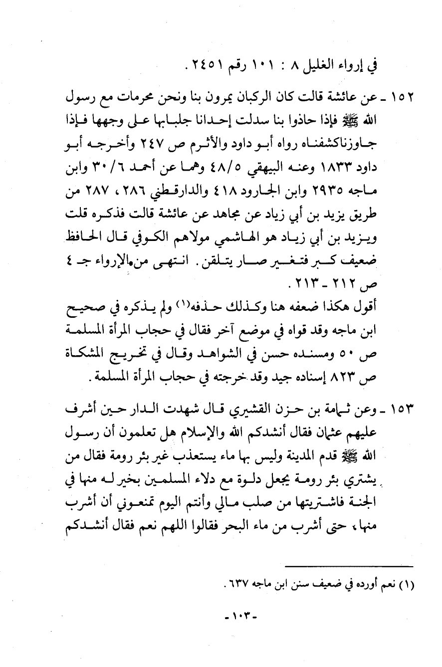 152- عن عائشة قالت: كان الركبان يمرون بنا ونحن محرمات مع ... رسول الله - صلى الله عليه وسلم - فإذا حاذوا بنا سدلت إحدانا جلبابها على وجهها، فإذا جاوزنا كشفناه. رواه أبو داود والأثرم (ص247) ، وأخرجه أبو داود (1833) ، وعنه البيهقي (5/48) ، وهما عن أحمد (6/30) ، وابن ماجة (2935) ، وابن الجارود (418) ، والدارقطني (286، 287) من طريق يزيد بن أبي زياد عن مجاهد عن عائشة قالت: ... فذكره. قلت: ويزيد بن أبي زياد هو الهاشمي مولاهم الكوفي قال الحافظ: ضعيف كبر فتغير صار يتلقن. انتهى من الإرواء (جـ 4 ص 212، 213) .
