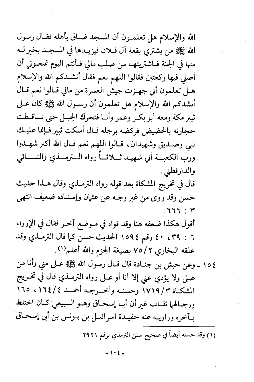 الله والإسلام هل تعلمون أن المسجد ضاق بأهله فقال رسول الله - صلى الله عليه وسلم -: «من يشتري بقعة آل فلان فيزيدها في المسجد بخير له منها في الجنة» . فاشتريتها من صلب مالي، فأنتم اليوم تمنعوني أن أصلي فيها ركعتين. فقالوا: اللهم نعم. فقال: أنشدكم الله والإسلام هل تعلمون أني جهزت جيش العسرة من مالي. قالوا: نعم قال: أنشدكم الله والإسلام هل تعلمون أن رسول الله - صلى الله عليه وسلم - كان على ثبير مكة ومعه أبو بكر وعمر وأنا فتحرك الجبل حتى تساقطت حجارته بالحضيض فركضه برجله قال: «اسكت ثبير، فإنما عليك نبي، وصديق، وشهيدان» . قالوا: اللهم نعم. قال: الله أكبر شهدوا ورب الكعبة أني شهيد ثلاثًا. رواه الترمذي، والنسائي، والدارقطني.