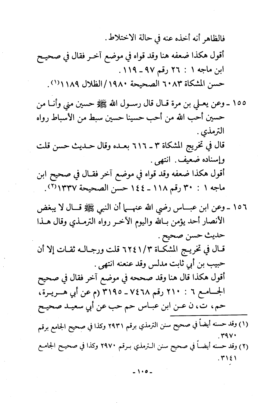 156- وعن ابن عباس رضي الله عنهما أن النبي - صلى الله عليه وسلم - قال: «لا يبغض الأنصار أحد يؤمن بالله واليوم الآخر» . رواه الترمذي، وقال: هذا حديث حسن صحيح.