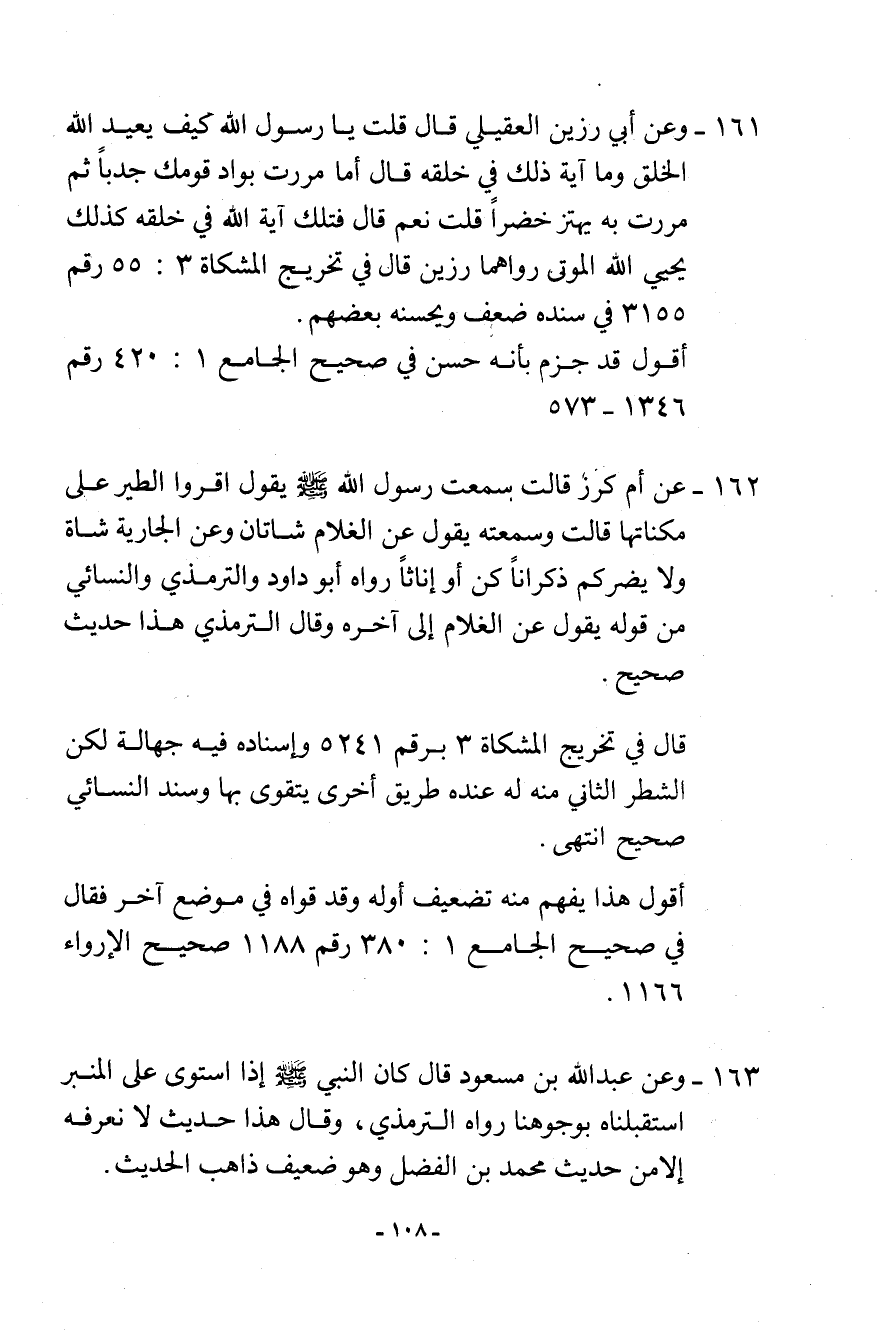 162- عن أم كرز قالت: سمعت رسول الله - صلى الله عليه وسلم - يقول: «اقروا الطير على مكانتها» . قالت: وسمعته يقول: «عن الغلام شاتان وعن الجارية شاة ولا يضركم ذكرانًا كن أو إناثًا» . رواه أبو داود، والترمذي والنسائي من قوله يقول: «عن الغلام ... إلى آخره. وقال الترمذي: هذا حديث صحيح.