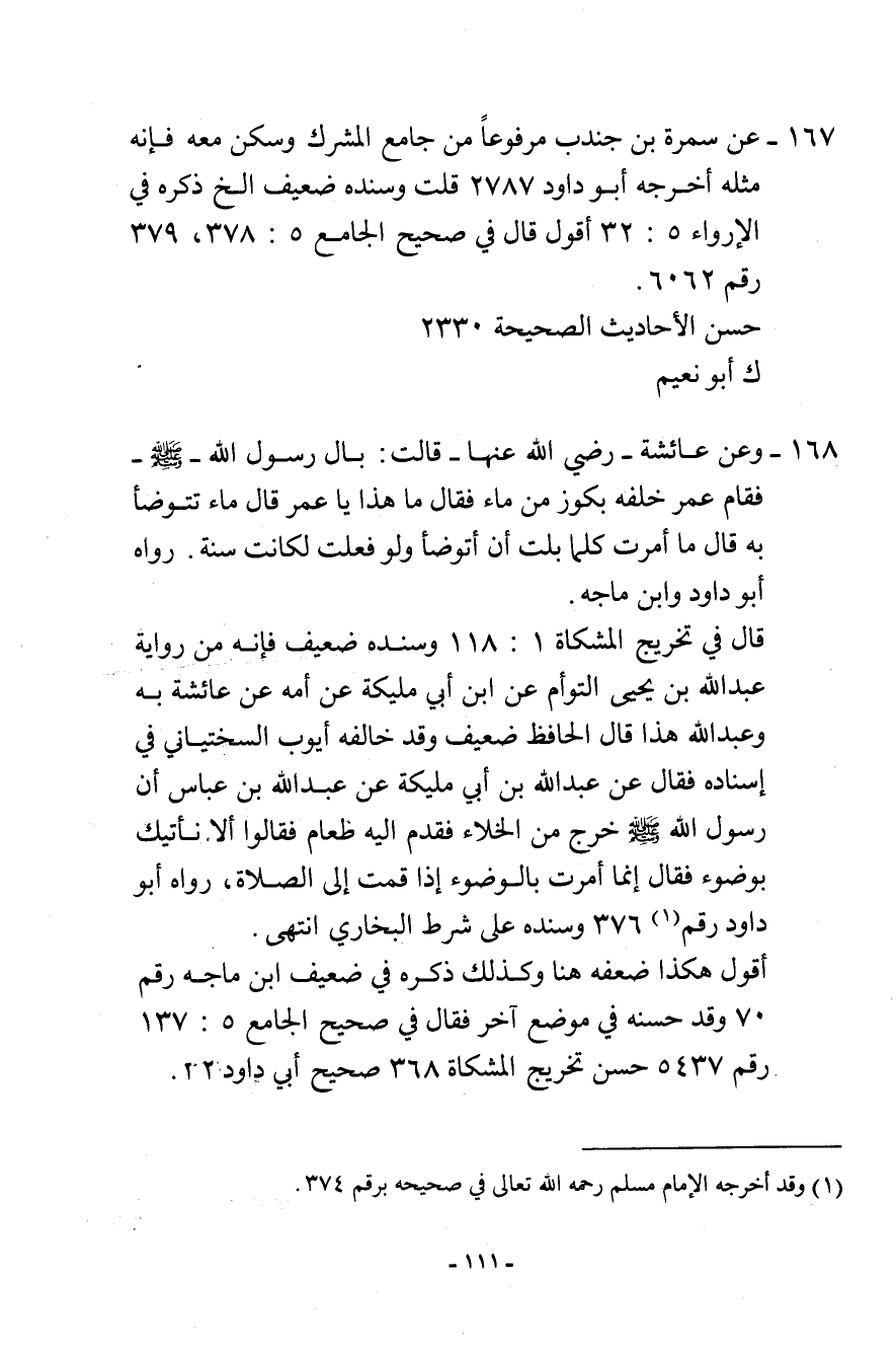 167- عن سمرة بن جندب مرفوعًا: «من جامع المشرك وسكن معه فإنه مثله» . أخرجه أبو داود (2787) قلت: وسنده ضعيف إلخ. ذكره في الإرواء (5: 32) أقول: قال في صحيح الجامع (5: 378، 379) رقم (6062) .