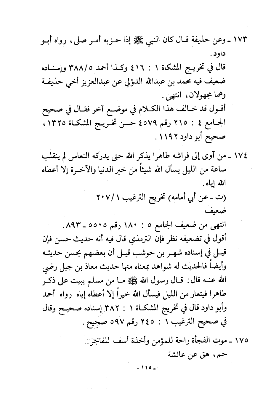 174-: «من آوى إلى فراشه طاهرًا يذكر الله حتى يدركه النعاس لم ينقلب ساعة من الليل يسأل الله شيئًا من خير الدنيا والآخرة إلا أعطاه الله إياه» .
